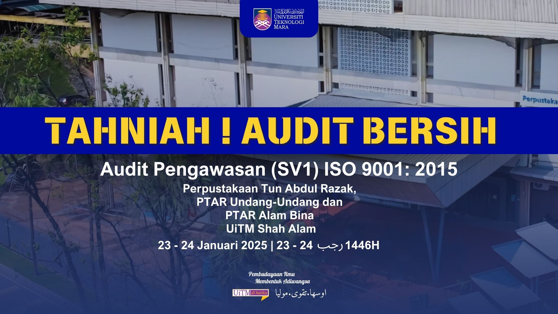 Alhamdullilah, tahun 2025 bermula dengan pencapaian Audit Bersih sempena Audit Pengawasan (SV1) ISO 9001:2015 di lokasi Perpustakaan Tun Abdul Razak, PTAR Undang-Undang dan PTAR Alam Bina. Kali ini, auditor LRQA, Encik Frederick Low menyatakan penambahbaikan perkhidmatan perpustakaan jelas memberi hala tuju yang bermanfaat untuk warga UiTM.