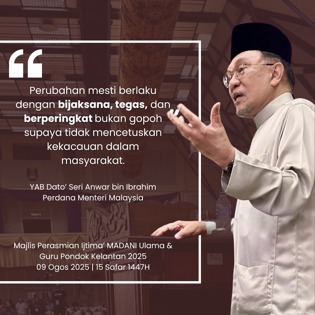 Ucapan YAB Perdana Menteri Malaysia benar-benar menyentuh hati dan membuka minda. Antara yang paling saya terkesan ialah peringatan bahawa pondok dan pesantren merupakan benteng terakhir mempertahankan akidah, ilmu, dan ruh perjuangan umat sejak zaman penjajahan, serta penegasan bahawa perubahan mesti dilakukan dengan kebijaksanaan, ketegasan, dan berperingkat supaya tidak mencetuskan kekacauan.