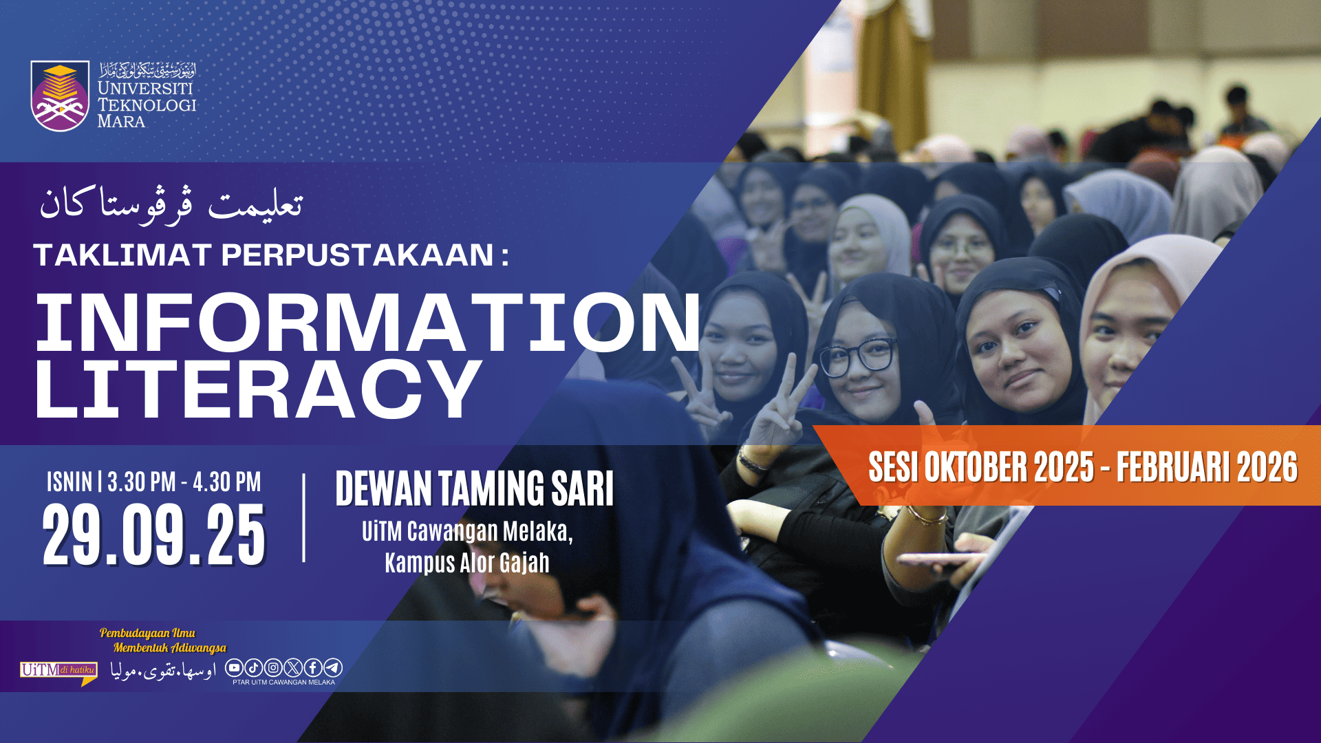 PTAR UiTM Cawangan Melaka, Kampus Alor Gajah akan menjalankan Taklimat Perpustakaan : Information Literacy Program sempena pendaftaran pelajar baharu sesi Oktober 2025 - Februari 2026 pada ketetapan berikut: