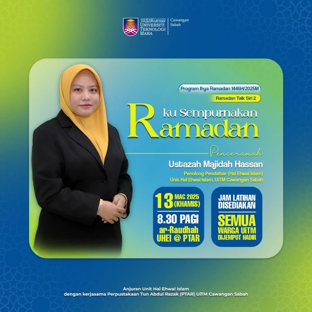 - Meningkatkan penghayatan ibadah – Memberi dorongan kepada warga UiTM Sabah untuk lebih tekun beribadah sepanjang bulan suci.