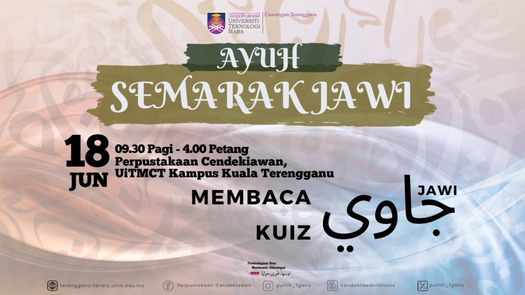 Pada 18 Jun 2025 (Rabu), Perpustakaan Cendekiawan Kampus Kuala Terengganu telah melaksanakan program Ayuh Semarak Jawi Vol. 01/2025 bermula jam 9.30 pagi sehingga jam 4.00 petang. Seramai 51 orang peserta telah memeriahkan program Ayuh Semarak Jawi yang dijalankan di Perpustakaan Cendekiawan.