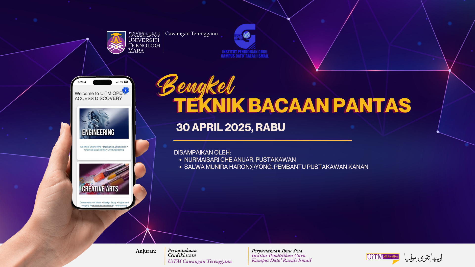 Program ini dianjurkan oleh Perpustakaan Cendekiawan UiTMCT dengan kerjasama Perpustakaan Ibnu Sina, IPG Kampus Dato’ Razali Ismail, bertujuan meningkatkan kemahiran bacaan pantas dalam kalangan siswa guru. Ia berlangsung pada 30 April 2025 (Rabu), dari pukul 11.00 pagi hingga 1.00 petang di Dewan Delima, IPG Kampus Dato’ Razali Ismail, Kuala Terengganu.