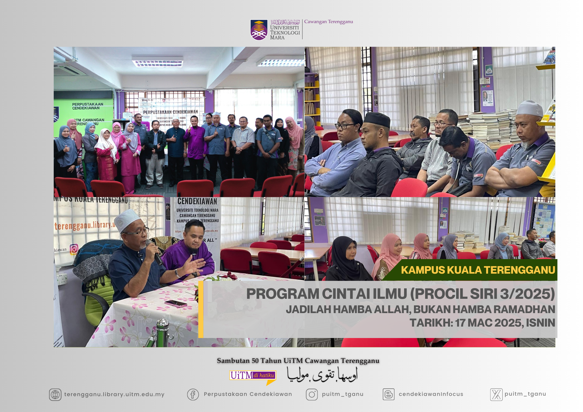 Pada 17 Mac 2025 (Isnin), Unit Hal Ehwal Islam dengan Kerjasama Unit Perpustakaan Cendekiawan dan Unit Pentadbiran UiTM Cawangan Terengganu Kampus Kuala Terengganu telah mengadakan Program Cintai Ilmu (PROCIL Siri 3/2025) yang bertajuk Jadilah Hamba Allah, Bukan Hamba Ramadhan bermula 10.00 pagi sehingga 11.30 pagi. Perkongsian ini telah disampaikan oleh Tuan Haji Ustaz Wahairi Mahmud merupakan bekas Pensyarah Akademi Pengajian Islam Kontemporari (ACIS), UiTM Cawangan Terengganu dan Ustaz Mohd Shahnizam Azmi, Penolong Pendaftar Kanan selaku Moderator. Program ini dijalankan secara bersemuka dan atas talian menggunakan Facebook Unit Korporat UiTM Kampus Kuala Terengganu. Seramai 150 orang telah menyertai program yang dijalankan selama 1 jam 30 minit.