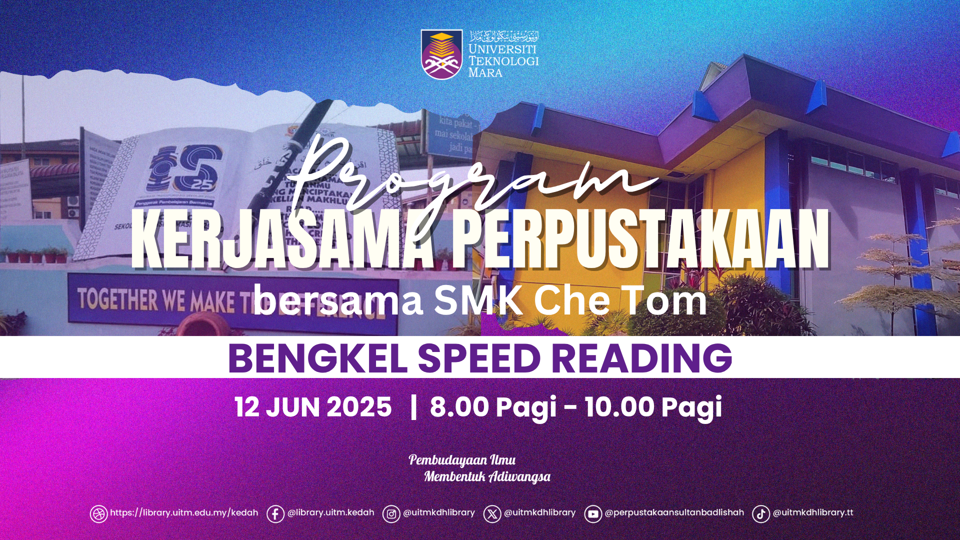 Merbok, 12 Jun 2025 – Program Speed Reading bersama pelajar SMK Che Tom, Sungai Petani merupakan inisiatif pembudayaan ilmu Perpustakaan Sultan Badlishah untuk memberikan pendedahan kepada peserta mengenai kewujudan teknik dan kaedah bacaan pantas yang boleh dipelajari melalui latihan bacaan pantas yang disediakan. Program ini merupakan satu usaha merealisasikan Perancangan Strategik Perpustakaan UiTM 2025 Key Performance Index (KPI) 5 – Bilangan Penyertaan Program Budaya Ilmu dan Performance Index (PI) 8 – Bilangan Penyertaan Komuniti Program Kolaborasi Perpustakaan dan juga Performance Index Universiti – Number of Reading and Literacy Initiatives Conducted / Coordinated / by PTAR UiTM.