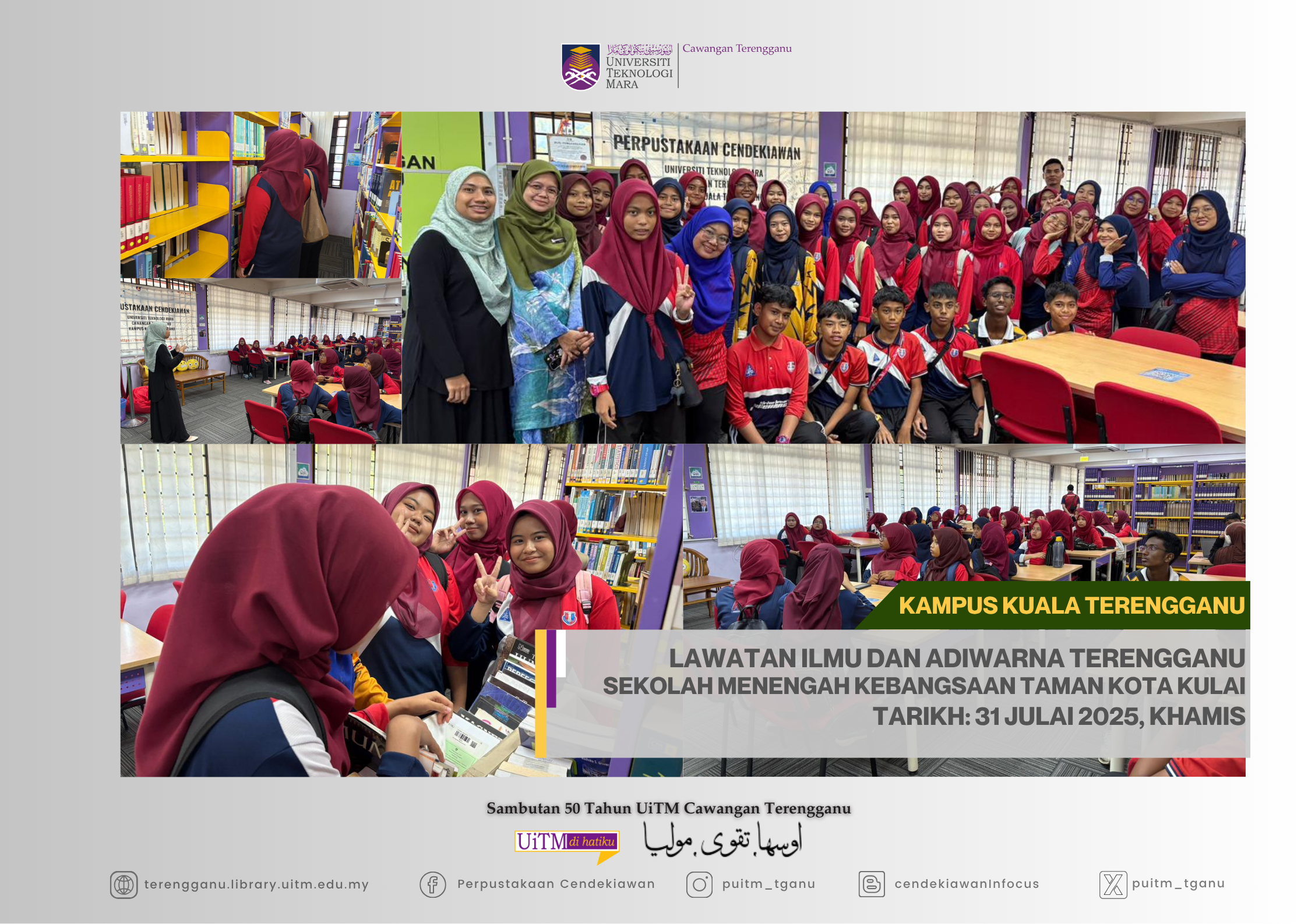 Pada 31 Julai 2025 (Khamis), Perpustakaan Cendekiawan telah menerima kunjungan daripada para pelajar Sekolah Menengah Kebangsaan Taman Kota Kulai bagi Lawatan Ilmu dan Adiwarna Terengganu yang telah dianjurkan oleh Unit Hal Ehwal Akademik, UiTMCT Kampus Kuala Terengganu. Seramai 35 orang pelajar serta 5 orang guru pengiring dan 2 orang staf HEA mengunjungi perpustakaan bagi lawatan sambil belajar bermula 3.30 petang sehingga 4.30 petang.