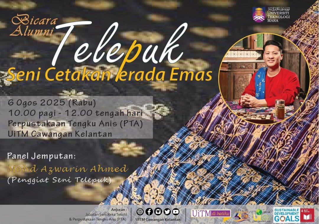 Pada 6 Ogos 2025 (Rabu), satu sesi Bicara Alumni bertajuk “Telepuk: Seni Cetakan Perada Emas” telah berlangsung di Bilik Seminar Perpustakaan Tengku Anis, UiTM Cawangan Kelantan (UiTMCK). Program yang berlangsung dari jam 10.00 pagi hingga 12.00 tengah hari ini menampilkan Encik Mohd Azwarin Ahmed, seorang penggiat seni Telepuk dan alumni Fakulti Seni Lukis & Seni Reka (FSSR) UiTMCK (1999–2005), sebagai panel jemputan.