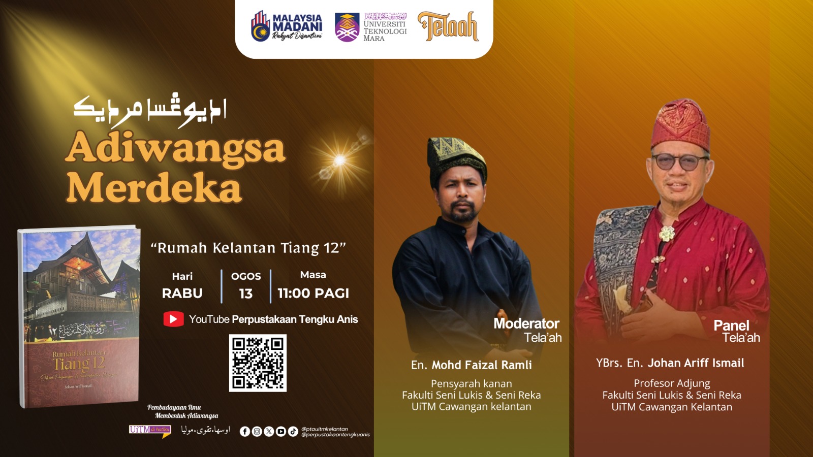 Program Tela’ah: Adiwangsa Merdeka telah berlangsung pada 13 Ogos 2025 (Rabu) secara hibrid iaitu melalui siaran langsung di saluran YouTube rasmi Perpustakaan Tengku Anis (PTA) dan secara fizikal di PTA bermula jam 11.00 pagi. Sesi ini merupakan sebahagian daripada Bicara Buku Bersama Alumni yang menampilkan kupasan buku “Rumah Kelantan Tiang 12”. Buku ini mengangkat keunikan seni bina tradisional negeri Kelantan yang sarat dengan nilai budaya, warisan, dan falsafah bangsa.