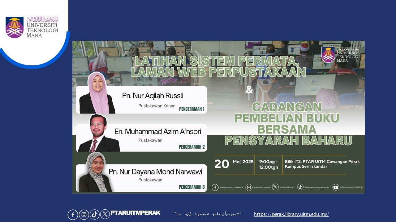 13 Ogos 2025: Perpustakaan Tun Abdul Razak (PTAR), UiTM Cawangan Perak Kampus Seri Iskandar telah menganjurkan Bengkel Latihan Sistem PERMATA, Laman Web Perpustakaan dan Cadangan Pembelian Buku pada 20 Mei 2025 bertempat di Bilik IT 2 , PTAR. Bengkel ini diadakan khusus untuk pensyarah lantikan baharu UiTM Cawangan Perak bagi memberi pendedahan awal berkenaan pelbagai kemudahan, perkhidmatan serta sistem digital yang ditawarkan oleh perpustakaan. Program ini berlangsung dari 9.00 pagi hingga 12.00 tengah hari dan mendapat sambutan positif daripada para peserta. Bengkel telah dikendalikan oleh tiga orang pustakawan berpengalaman iaitu Puan Nur Aqilah binti Russli, Pustakawan Kanan, Puan Nur Dayana Binti Mohd Narwawi, Pustakawan dan Encik Muhamad Azim Bin A’nsori, Pustakawan.