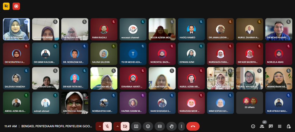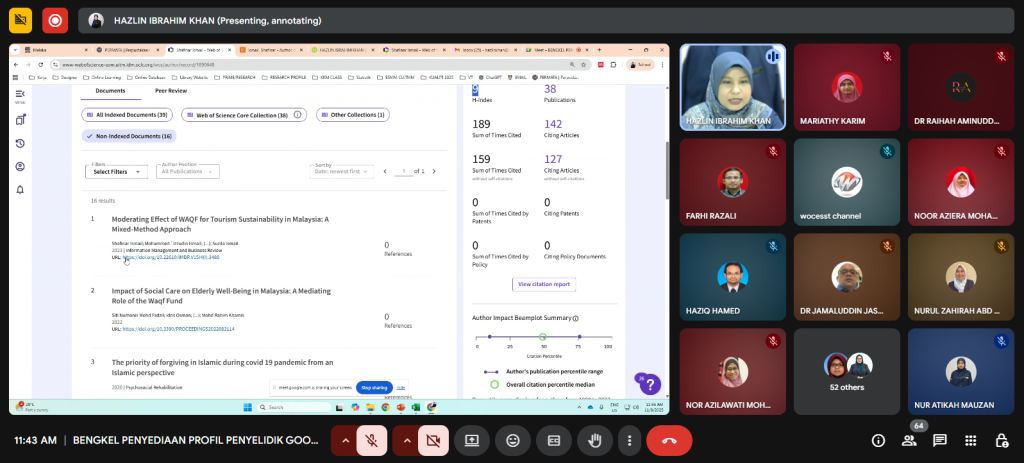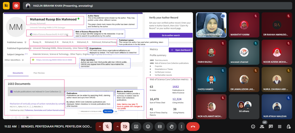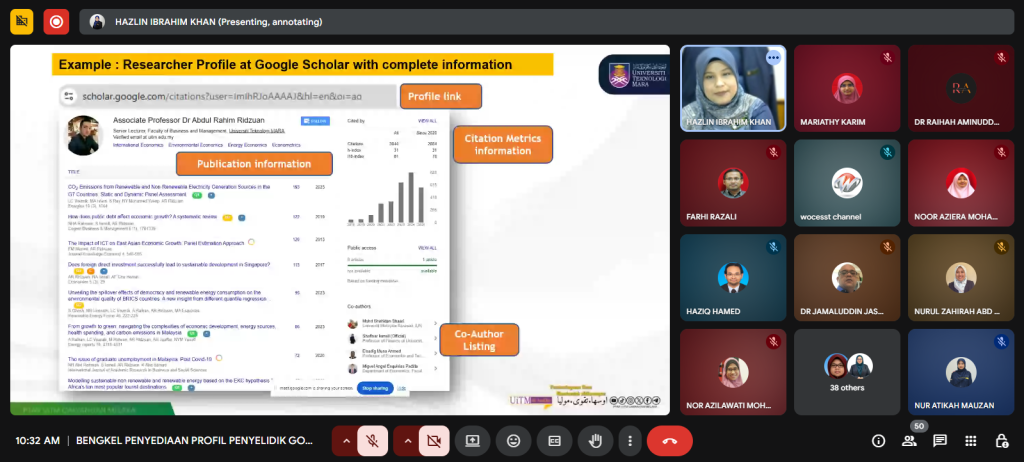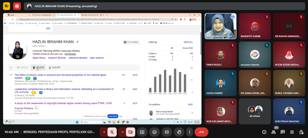 11 September 2025 | Khamis – Bagi menyokong inisiatif meningkatkan visibiliti penyelidik UiTM di peringkat global serta memperkukuh budaya penyelidikan berimpak tinggi, Unit Jurnal dan Penerbitan Universiti (JPU) Bahagian Penyelidikan dan Jaringan Industri (PJI), dengan kerjasama Perpustakaan Tun Abdul Razak (PTAR), UiTM Cawangan Melaka, telah menganjurkan Bengkel Penyediaan Profil Penyelidik di Google Scholar, Scopus dan Web of Science (WoS) secara dalam talian melalui platform Google Meet.