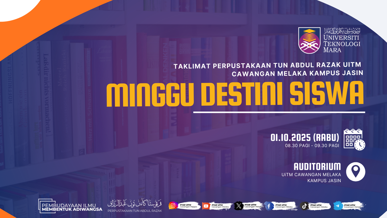 1 Oktober 2025, Rabu- PTAR UiTM Cawangan Melaka Kampus Jasin telah dijemput untuk memberikan Taklimat Perpustakaan bagi program Minggu Destini Siswa (MDS) sempena pendaftaran pelajar baharu Sesi Oktober 2025. Taklimat berkenaan PTAR ini telah dijalankan secara bersemuka di Auditorium, UiTM Cawangan Melaka Kampus Jasin, bermula jam 8.30 pagi.