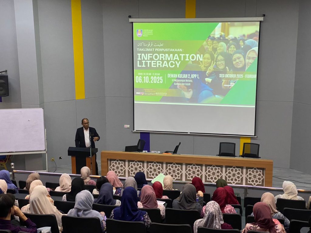 6 Oktober 2025, Isnin – Perpustakaan Tun Abdul Razak (PTAR), UiTM Cawangan Melaka, Kampus Alor Gajah telah menganjurkan Taklimat Perpustakaan : Information Literacy Program bagi pelajar Ijazah dari Fakulti Perakaunan (FPN) dan Fakulti Seni Lukis dan Seni Reka (FSSR), UiTM Cawangan Melaka, Kampus Alor Gajah sempena pendaftaran pelajar baharu. Program ini merupakan sebahagian daripada pengisian Minggu Destini Siswa (MDS) dan berlangsung dari jam 10.30 pagi hingga 11.30 pagi, di Dewan Kuliah 2, KPP 1, UiTM Cawangan Melaka, Kampus Alor Gajah.