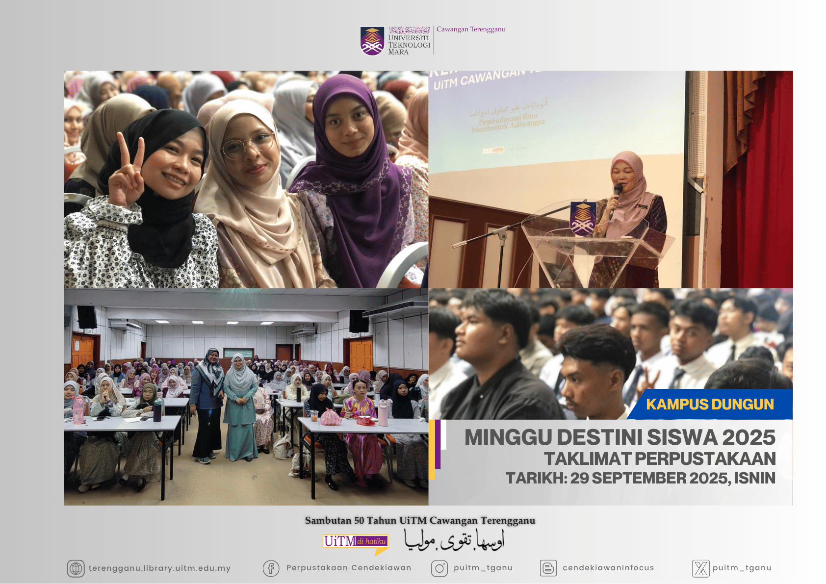 Sempena Minggu Destini Siswa (MDS) UiTM Cawangan Terengganu Kampus Dungun Sesi Oktober 2025 – Februari 2026, Perpustakaan Cendekiawan Kampus Dungun telah dijemput untuk mengisi slot Taklimat Perpustakaan kepada seramai 1,971 orang mahasiswa/i baharu yang terdiri daripada pelajar Diploma, dan Ijazah Sarjana Muda pada 29 September 2025, Isnin.