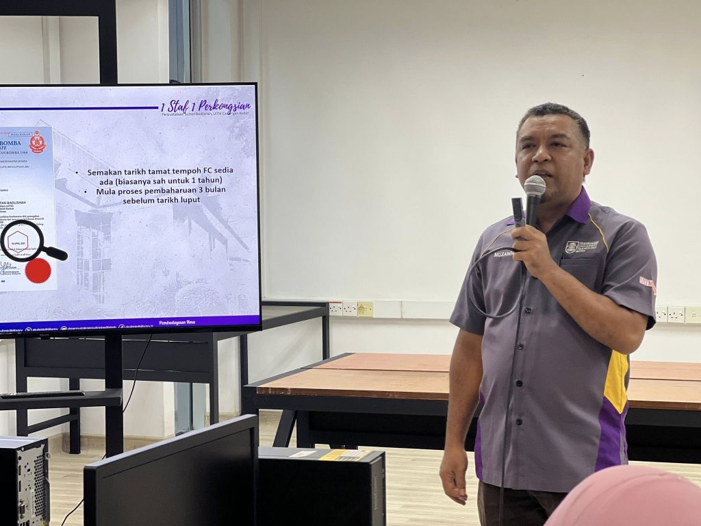 Sesi kedua pula disampaikan oleh Encik Muzammil Mohd Mustaffa dengan tajuk “Proses Kerja Pembaharuan Perakuan BOMBA”. Beliau menjelaskan kepentingan sijil perakuan BOMBA bagi memastikan keselamatan nyawa dan harta benda melalui pepasangan keselamatan kebakaran (PKK) yang sentiasa berfungsi serta langkah pencegahan yang berkesan.