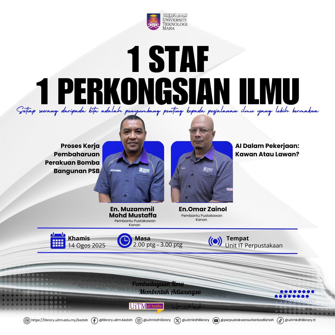 Merbok, 13 Ogos 2025 – Perpustakaan Sultan Badlishah (PSB), UiTM Cawangan Kedah telah menganjurkan Program 1 Staf 1 Perkongsian Ilmu: Siri 5 bertempat di Sudut IT, PSB. Program yang berlangsung dari jam 3.00 hingga 4.00 petang ini dihadiri oleh seramai 17 orang peserta terdiri daripada staf perpustakaan. Inisiatif ini merupakan usaha PSB untuk memupuk budaya perkongsian ilmu dalam kalangan staf sekaligus menggalakkan persekitaran kerja yang lebih kolaboratif dan dinamik.