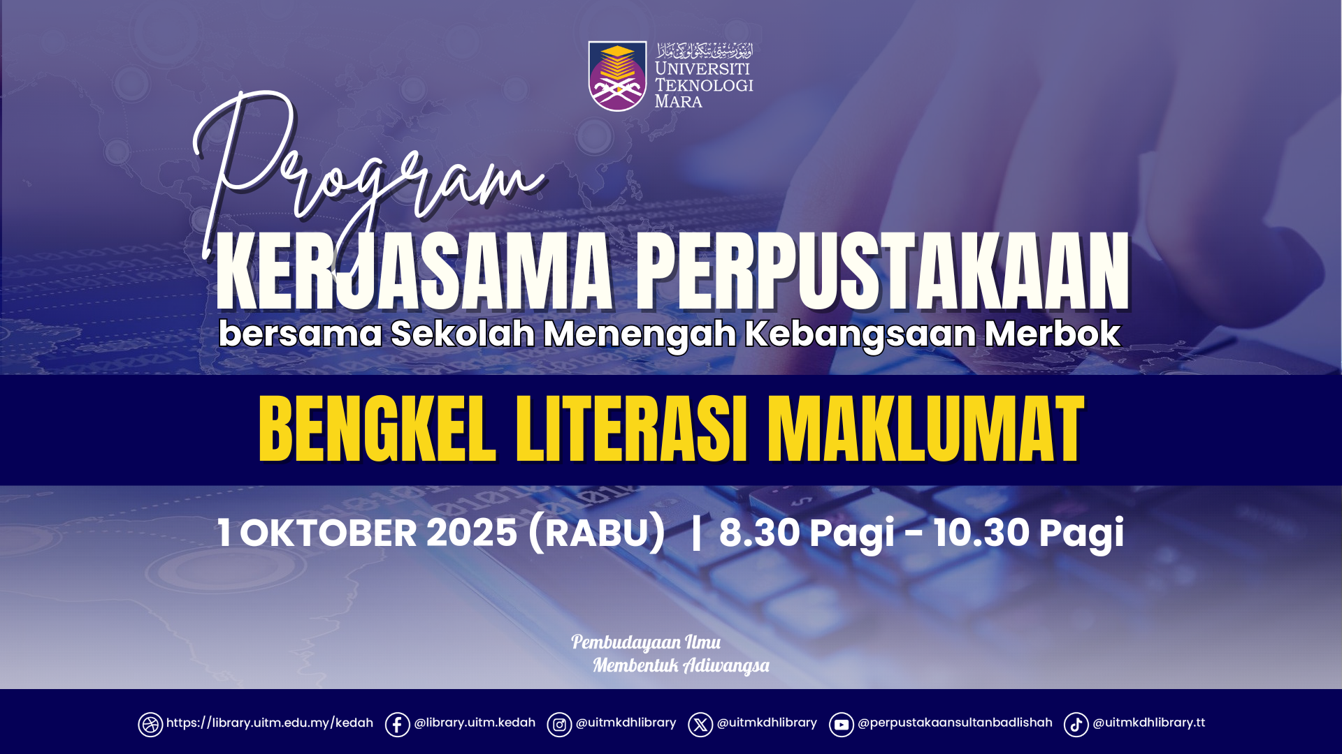 Merbok, 1 Oktober 2025 – Perpustakaan Sultan Badlishah (PSB), UiTM Cawangan Kedah telah berjaya melaksanakan Program Kerjasama Pembudayaan Ilmu: Literasi Maklumat bersama Sekolah Menengah Kebangsaan (SMK) Merbok, Kedah. Program yang berlangsung di Makmal Komputer SMK Merbok dari jam 8.30 pagi hingga 10.30 pagi ini merupakan inisiatif di bawah Perancangan Strategik Perpustakaan UiTM 2025 yang menyokong KPI 5 (Program Budaya Ilmu) dan PI 8 (Program Kolaborasi Perpustakaan). Pelaksanaan program ini memberi impak positif dalam memperkasa kemahiran maklumat pelajar serta memupuk kesedaran terhadap kepentingan literasi digital dalam pembelajaran masa kini.