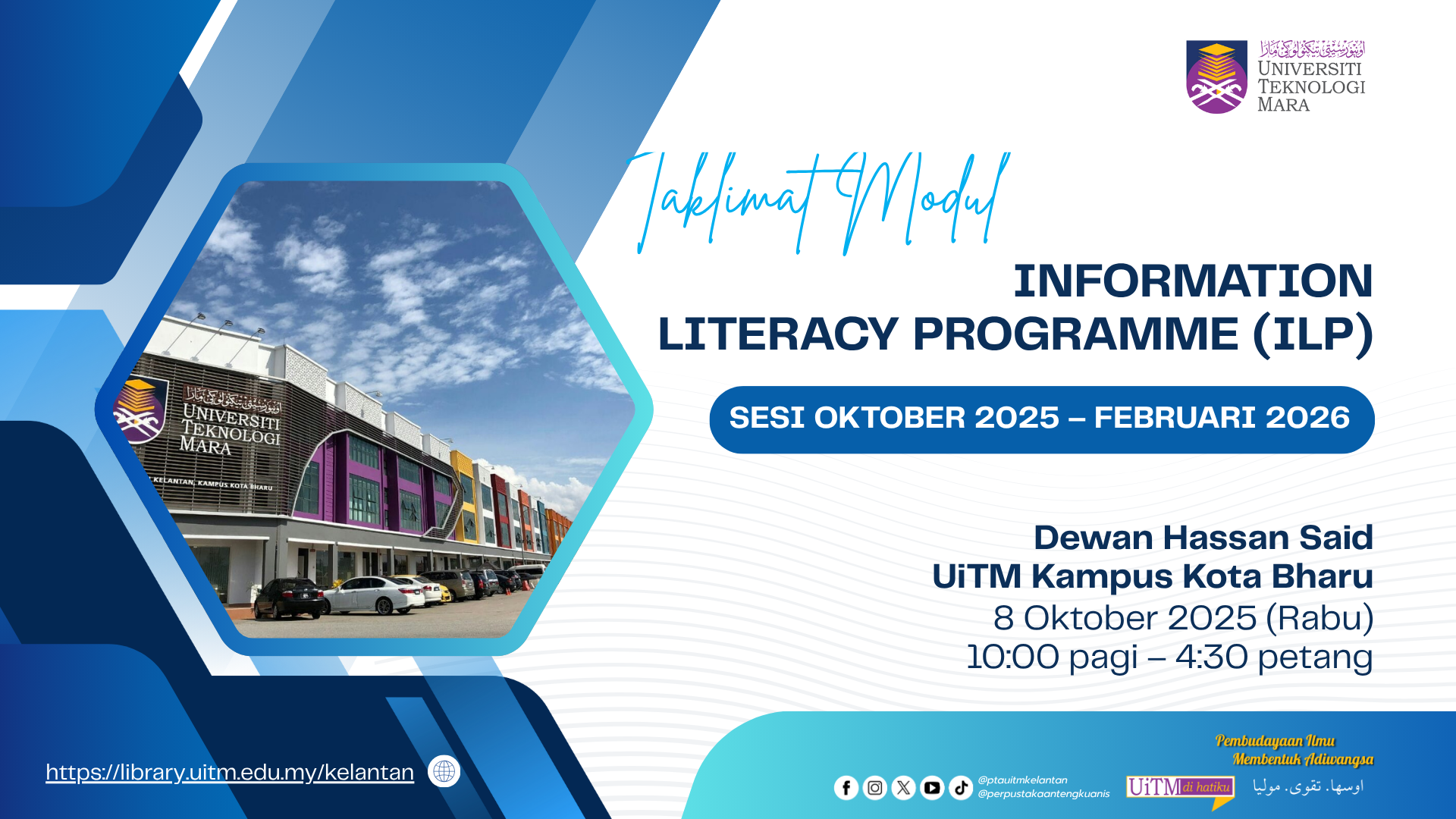 Taklimat Modul Information Literacy Programme (ILP) telah diadakan pada 8 Oktober 2025 bertempat di Perpustakaan Tengku Anis UiTM Cawangan Kelantan Kampus Kota Bharu (PTAKKB). Program ini dibahagikan kepada dua sesi mengikut program yang telah dijadualkan dan dilaksanakan khusus untuk pelajar Ijazah Sesi Akademik 2025/2026 dengan tujuan utama memberi pendedahan serta meningkatkan kemahiran literasi maklumat dalam kalangan pelajar baharu. Taklimat modul ILP telah dikendalikan oleh Puan Rosmariyati AB Rahman (Timbalan Ketua Pustakawan) (M) (KUP), dan turut dibantu Bersama staf-staf PTAKKB.