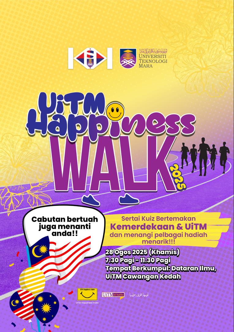 Merbok, 28 Ogos 2025 – UiTM Cawangan Kedah telah menyertai acara tahunan peringkat universiti, iaitu UiTM Happiness Walk 2025 (UHW2025) yang berlangsung serentak di seluruh kampus UiTM. Bertempat di Dataran Ilmu, program ini dianjurkan dengan kerjasama Perpustakaan Sultan Badlishah, Bahagian Pentadbiran, serta Kelab Staf UiTM Kedah (KSUK). Seramai 120 peserta terdiri daripada warga UiTM telah mengambil bahagian. Acara ini bukan sekadar aktiviti riadah, malah menjadi platform memperkukuh silaturahim antara staf dan pelajar serta menyemarakkan semangat Hari Kemerdekaan.