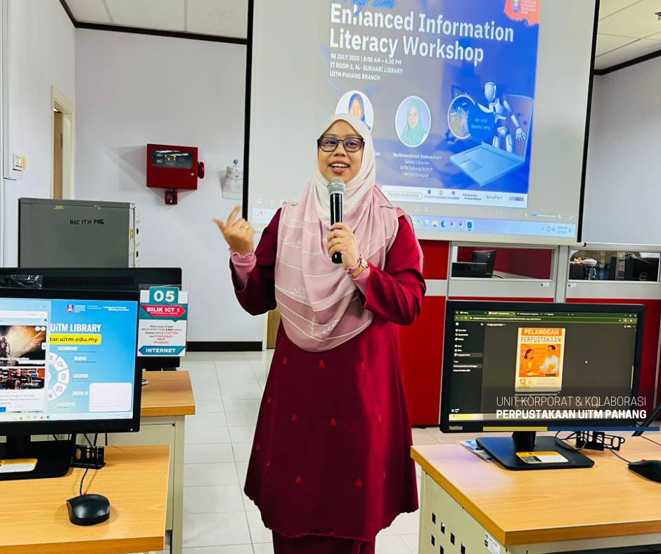 Satu program khas bertajuk “Enhanced Information Literacy Workshop” telah berjaya diadakan pada 4 Julai 2025 bertempat di Bilik IT 1, Perpustakaan Al-Bukhari, UiTM Cawangan Pahang. Bengkel ini berlangsung dari jam 8.00 pagi hingga 4.30 petang dan melibatkan penyertaan aktif daripada staf perpustakaan Kampus Jengka dan Raub.