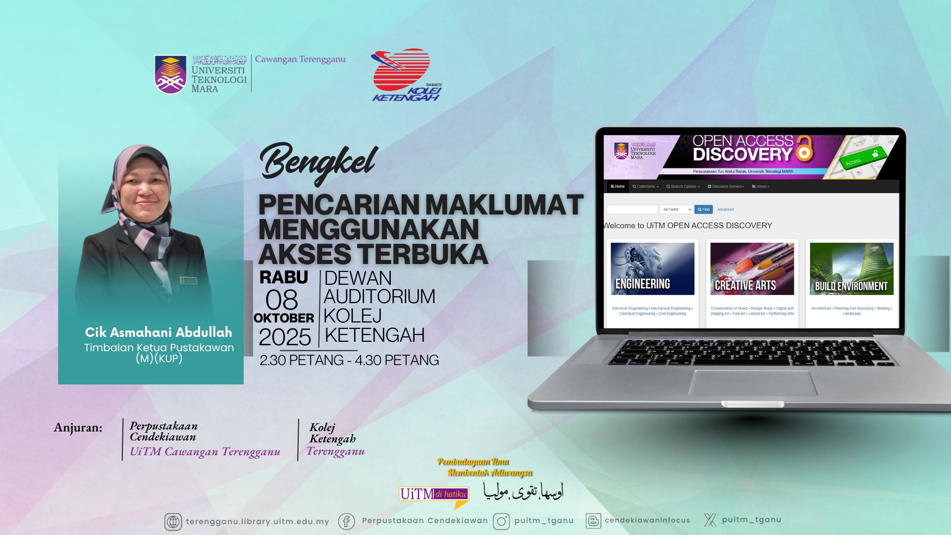Pada 8 Oktober 2025 (Rabu) yang lalu, Perpustakaan Cendekiawan UiTMCT Kampus Dungun telah mengadakan Bengkel Pencarian Maklumat Menggunakan Pangkalan Data Akses Terbuka bersama pelajar Kolej KETENGAH sebagai salah satu inisiatif untuk meningkatkan kemahiran literasi maklumat dan penyelidikan dalam kalangan pelajar sebagai alternatif pencarian maklumat di samping menggunakan pangkalan data langganan kolej mereka.