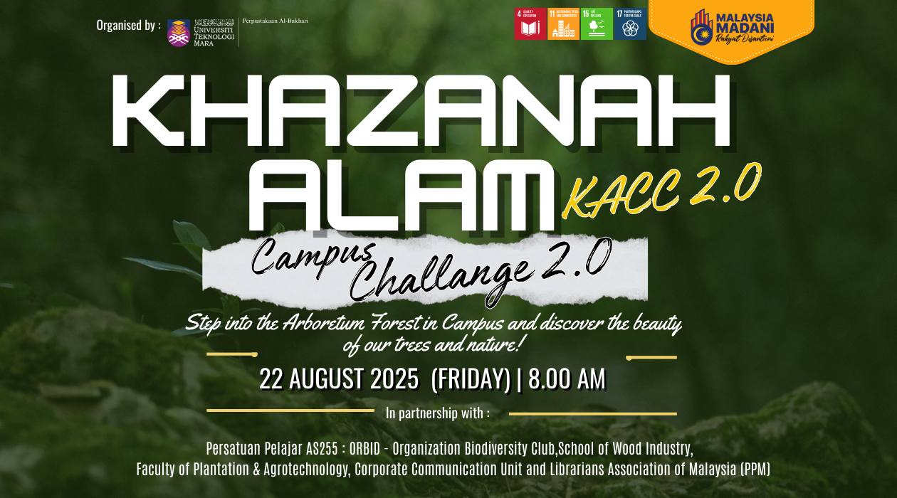 Khazanah Alam Campus Challenge 2.0 (KACC) 2025 anjuran Perpustakaan Al-Bukhari (PAB) dengan kerjasama Persatuan Pustakawan Malaysia (PPM), Fakulti Perladangan dan Agroteknologi, Unit Komunikasi Korporat serta Persatuan Pelajar AS255 : ORBID – Organization Biodiversity Club.