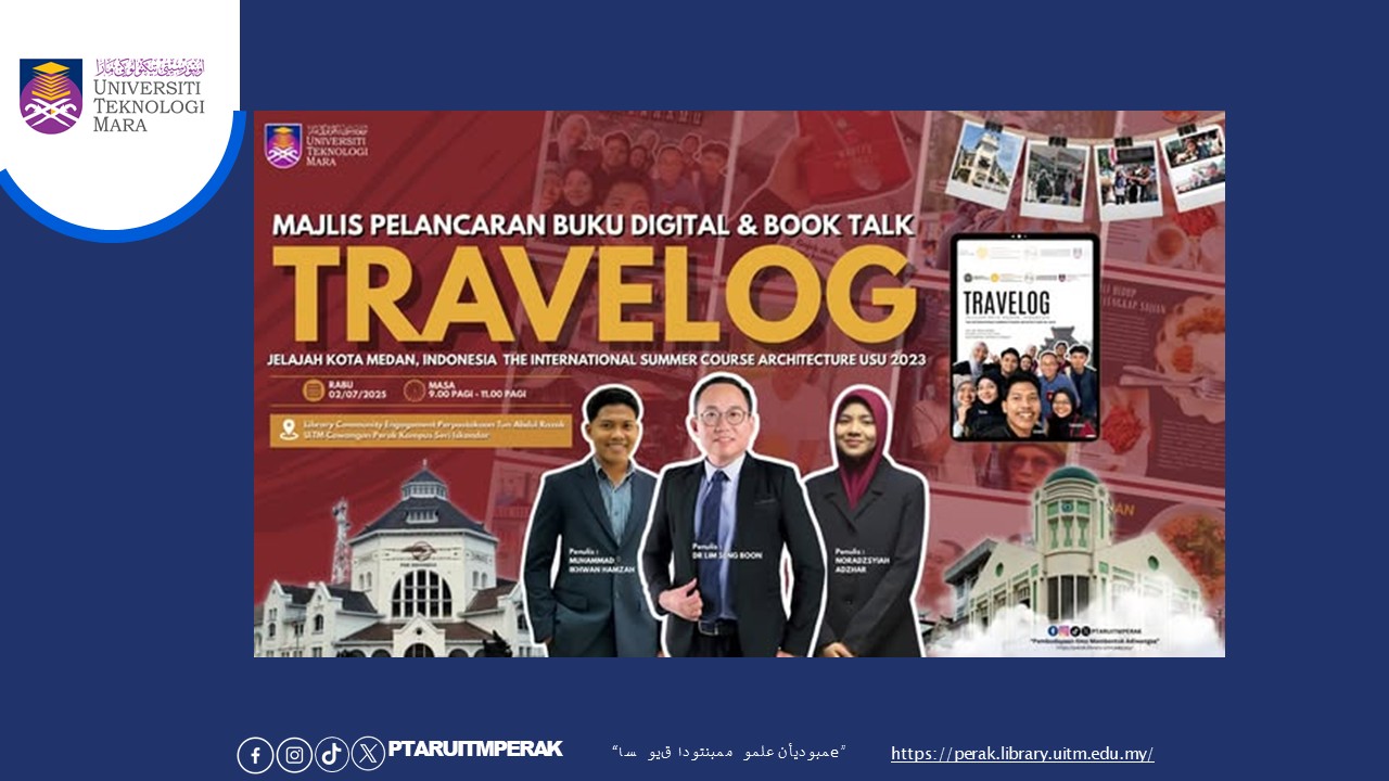 21 Oktober 2025: Perpustakaan Tun Abdul Razak (PTAR), UiTM Cawangan Perak Kampus Seri Iskandar telah menganjurkan Majlis Pelancaran Buku Digital dan Book Talk: Travelog – Jelajah Kota Medan, Indonesia (The International Summer Course Architecture USU 2023) pada 2 Julai 2025 bertempat di Library Community Engagement. Program ini merupakan salah satu inisiatif warga akademik bertujuan menghargai hasil penulisan akademik warga UiTM serta memperkasa budaya ilmu melalui perkongsian pengalaman dan pembelajaran antarabangsa. Penganjuran ini selaras dengan hasrat universiti dalam memperkukuh jaringan akademik dan mempromosikan penerbitan digital sebagai medium penyebaran ilmu yang dinamik dan mudah diakses.