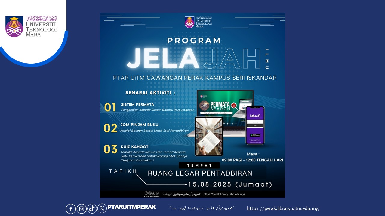 5 November 2025: Perpustakaan Tun Abdul Razak (PTAR) UiTM Cawangan Perak Kampus Seri Iskandar telah menganjurkan Program Jelajah Ilmu pada 15 Ogos 2025 bertempat di Ruang Legar Pentadbiran . Program ini merupakan salah satu inisiatif strategik PTAR dalam memperluas jangkauan perkhidmatan perpustakaan serta meningkatkan kesedaran warga universiti terhadap kemudahan dan sumber ilmu yang ditawarkan. Melalui penganjuran ini, PTAR berusaha mendekatkan fungsi perpustakaan kepada komuniti kampus dengan pendekatan yang lebih interaktif dan inklusif.