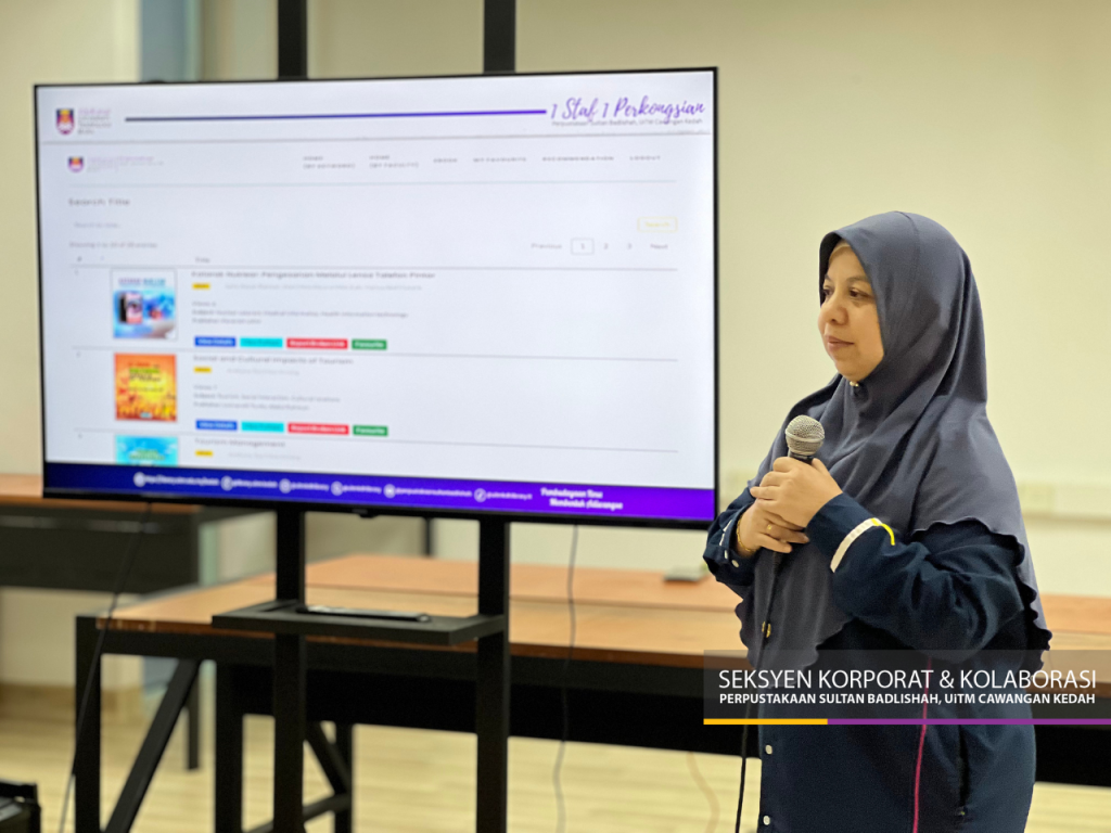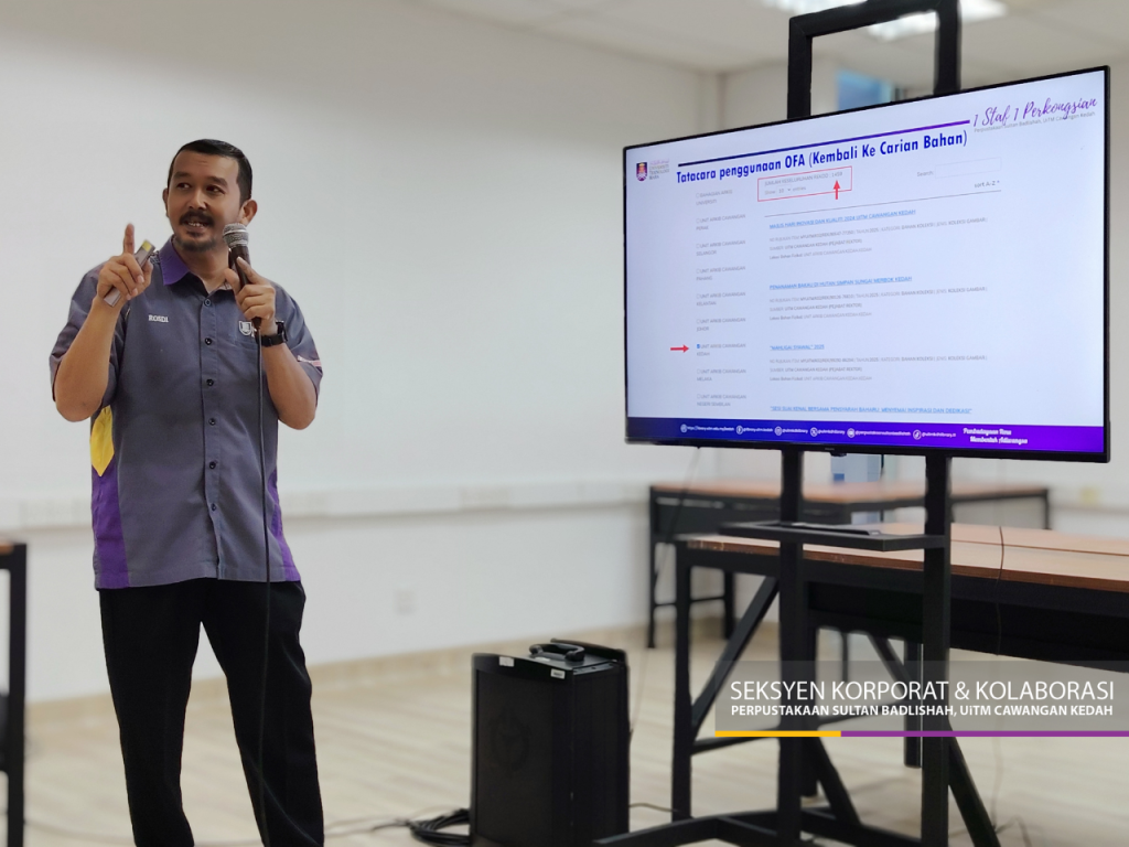 Merbok, 5 November 2025 – Perpustakaan Sultan Badlishah (PSB), UiTM Cawangan Kedah telah berjaya menganjurkan Program 1 Staf 1 Perkongsian Ilmu Siri 10, bertempat di Sudut IT, PSB. Program yang berlangsung dari jam 3.30 hingga 4.30 petang ini diadakan sebagai salah satu inisiatif PSB untuk memupuk budaya perkongsian ilmu dalam kalangan warga perpustakaan. Objektif utama program ini adalah untuk menggalakkan staf berkongsi pengetahuan dan kepakaran masing-masing, memperkukuh profesionalisme, serta menjadikan amalan perkongsian ilmu sebagai budaya organisasi di PSB.
