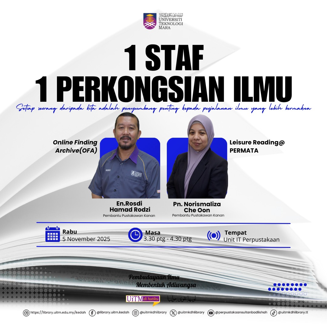 Merbok, 5 November 2025 – Perpustakaan Sultan Badlishah (PSB), UiTM Cawangan Kedah telah berjaya menganjurkan Program 1 Staf 1 Perkongsian Ilmu Siri 10, bertempat di Sudut IT, PSB. Program yang berlangsung dari jam 3.30 hingga 4.30 petang ini diadakan sebagai salah satu inisiatif PSB untuk memupuk budaya perkongsian ilmu dalam kalangan warga perpustakaan. Objektif utama program ini adalah untuk menggalakkan staf berkongsi pengetahuan dan kepakaran masing-masing, memperkukuh profesionalisme, serta menjadikan amalan perkongsian ilmu sebagai budaya organisasi di PSB.