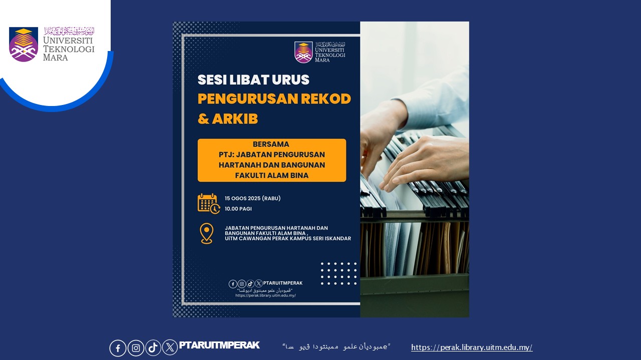 10 November 2025: Unit Arkib Cawangan (UAC) Perpustakaan Tun Abdul Razak (PTAR) UiTM Cawangan Perak telah menganjurkan Sesi Libat Urus Pengurusan Rekod Bersama PTJ: Jabatan Pengurusan Hartanah dan Bangunan Fakulti Alam Bina, UiTM Cawangan Perak Kampus Seri Iskandar. Sesi ini telah berlangsung pada 15 Ogos 2025 bertempat di Jabatan Pengurusan Hartanah dan Bangunan Fakulti Alam Bina. Penganjuran ini adalah selaras dengan hala tuju Perancangan Strategik Perpustakaan UiTM 2025 khususnya di bawah penetapan Petunjuk Prestasi (PI) 2: Bilangan Libat Urus Pengurusan Rekod dan Arkib Bersama Pusat Tanggungjawab. Sesi libat urus ini berfungsi sebagai platform perbincangan dan pertemuan fomral antara UAC dengan pihak PTJ bagi menangani isu serta prosedur berkaitan pengurusan rekod awam dan pelajar.