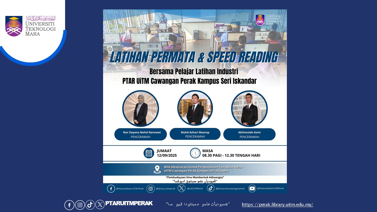 23 Disember 2025: Perpustakaan Tun Abdul Razak (PTAR), UiTM Cawangan Perak Kampus Seri Iskandar telah berjaya menganjurkan sesi Latihan PERMATA dan Speed Reading pada 12 September 2025. Program penting ini telah diadakan di Bilik Mesyuarat Utama PTAR dan melibatkan penyertaan daripada pelajar yang sedang menjalani latihan industri di perpustakaan tersebut. Inisiatif ini dilaksanakan dengan matlamat utama untuk memperkenalkan sistem maklumat baharu perpustakaan iaitu sistem PERMATA di samping memperkasakan kemahiran membaca pantas (speed reading) dalam kalangan peserta.