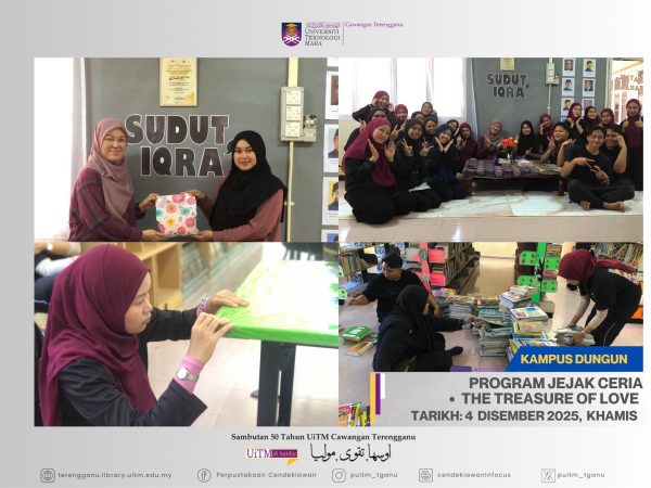 Tarikh: 4 Disember 2025, KhamisMasa: 8.00 pagi – 1.00 petangTempat: Asrama Pertubuhan Kebajikan Anak Yatim Terengganu (PERKAYA), Marang, TerengganuAnjuran: Kelab Students’ Knowledge And Technology Resources (SKATER) UiTMCTDengan kerjasama: Perpustakaan Cendekiawan….