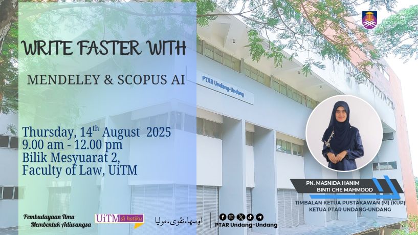 Shah Alam, 14 Ogos 2025 – Perpustakaan Tun Abdul Razak (PTAR) Undang-Undang telah berjaya menganjurkan Bengkel Write Faster with Mendeley & Scopus AI bersama Fakulti Undang-Undang (FUU), UiTM yang berlangsung di Bilik Mesyuarat FUU. Program ini telah diadakan pada 14 Ogos 2025, bermula jam 9.00 pagi hingga 1.00 petang.