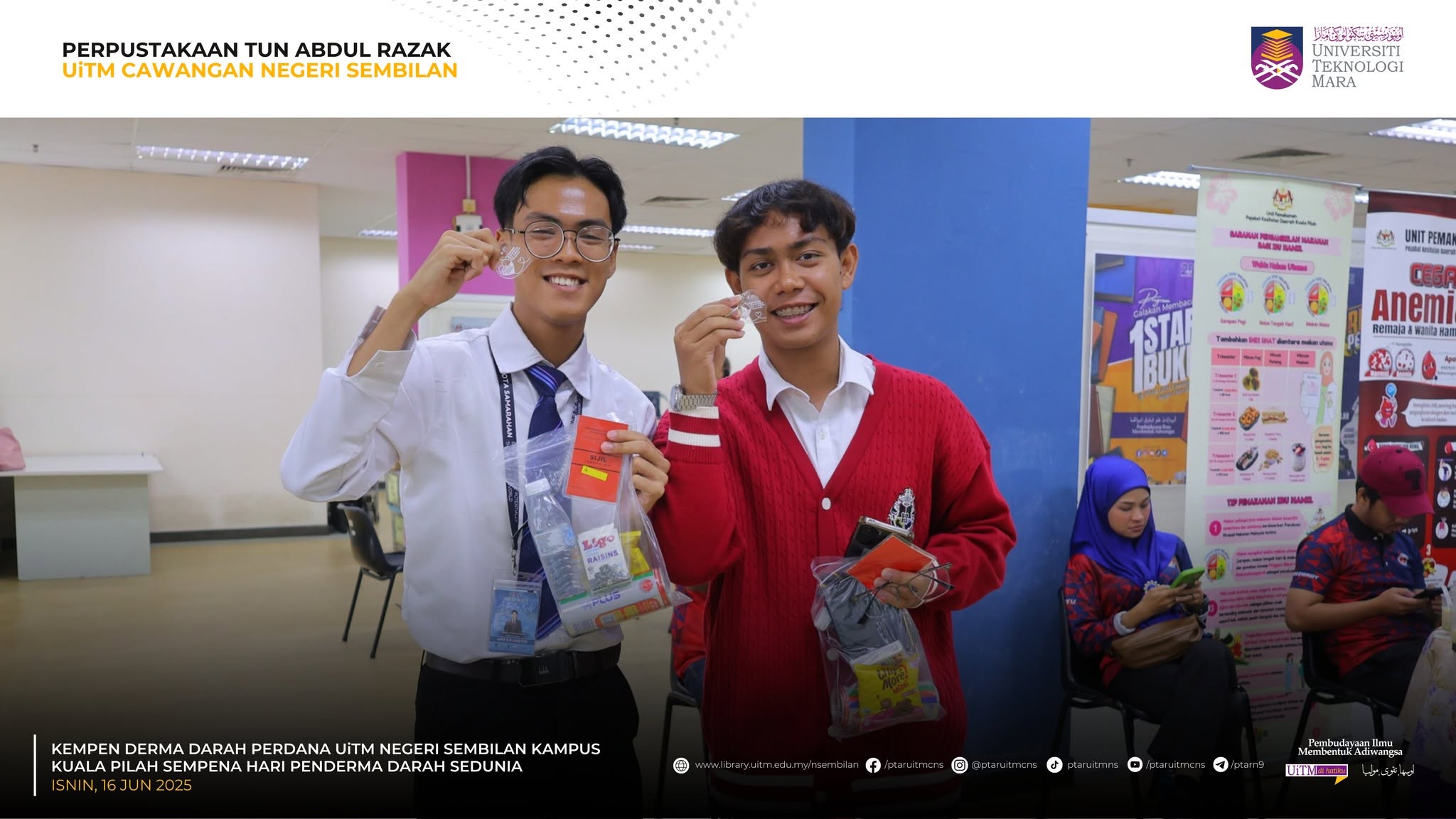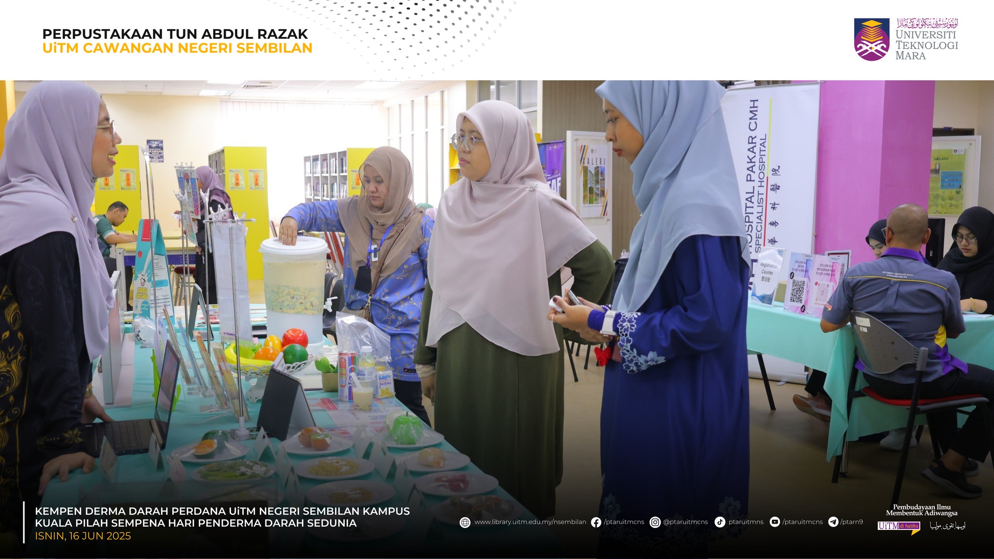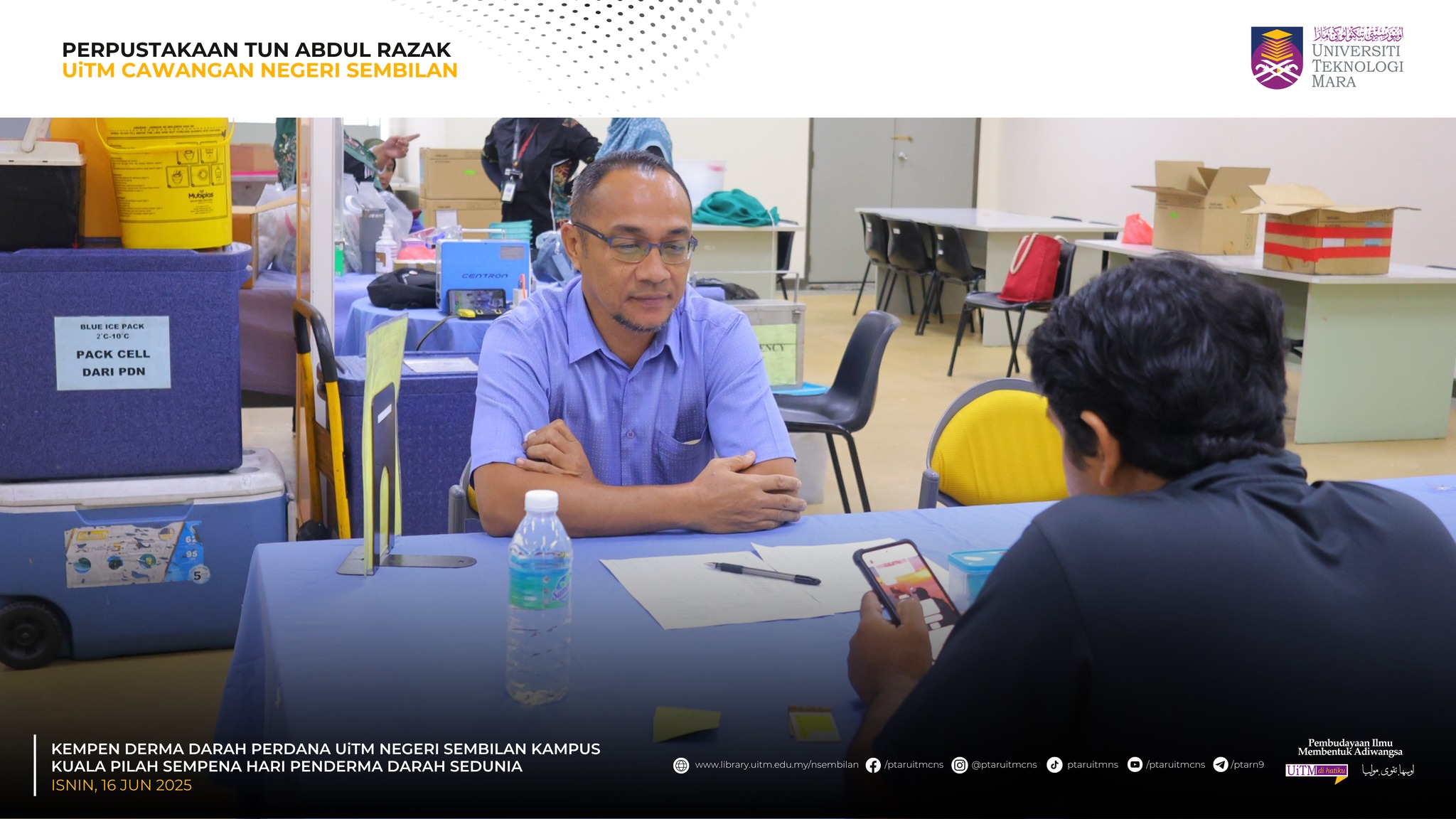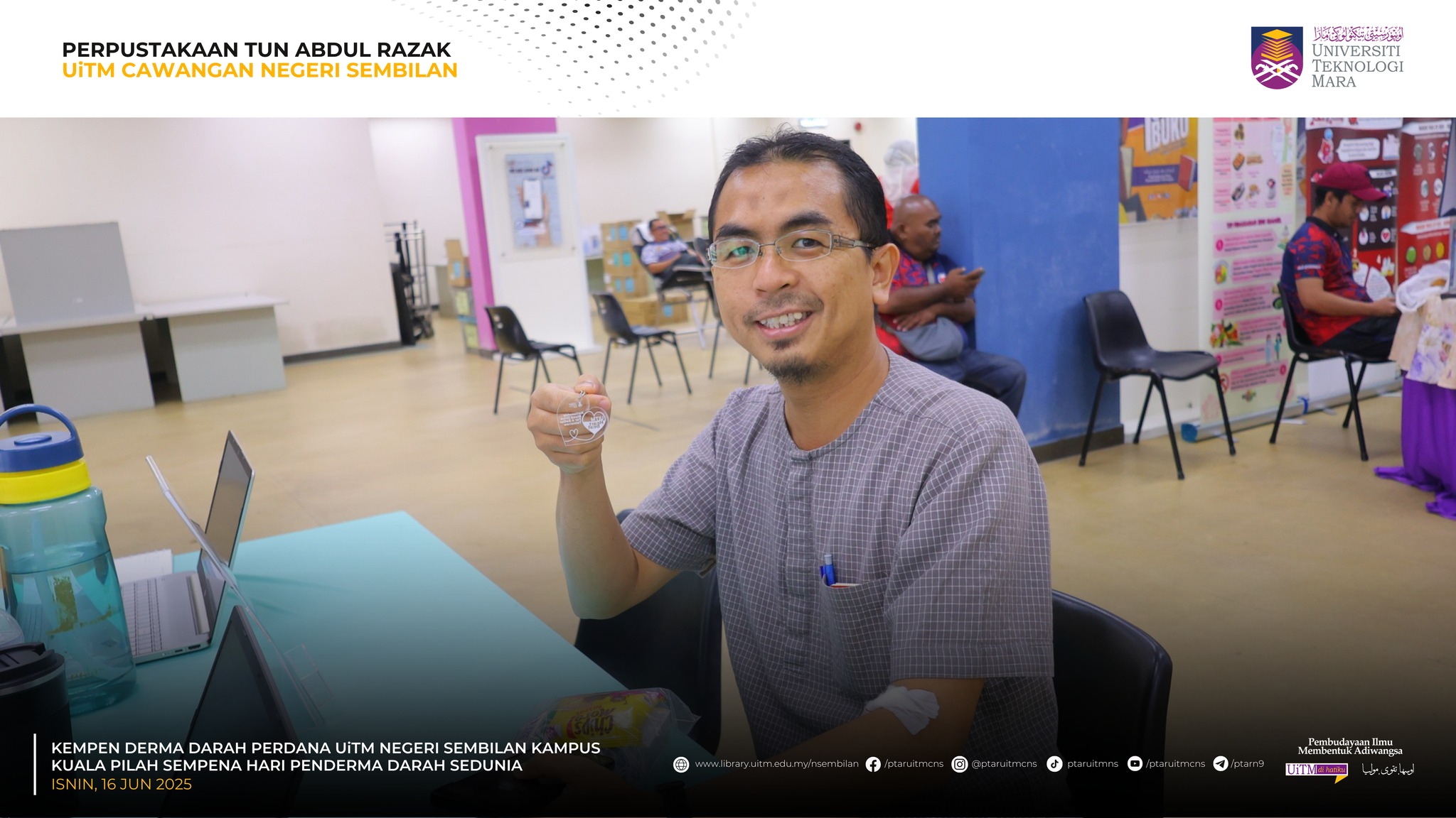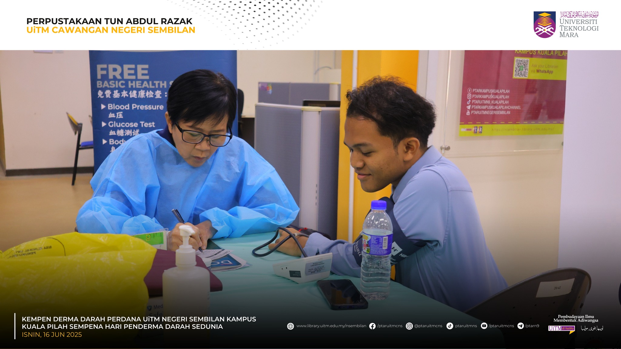 KUALA PILAH, 16 Jun 2025 – Perpustakaan Tun Abdul Razak (PTAR) UiTM Cawangan Negeri Sembilan telah terlibat secara langsung dalam Kempen Derma Darah Perdana dan saringan kesihatan, sempena Hari Penderma Darah Sedunia peringkat UiTM Cawangan Negeri Sembilan anjuran bersama Perpustakaan Tun Abdul Razak yang turut berlangsung secara serentak di UiTM seluruh negara.