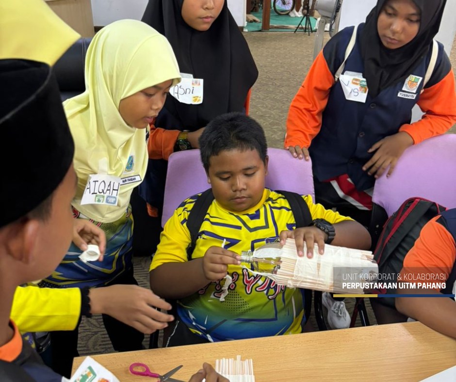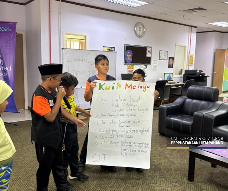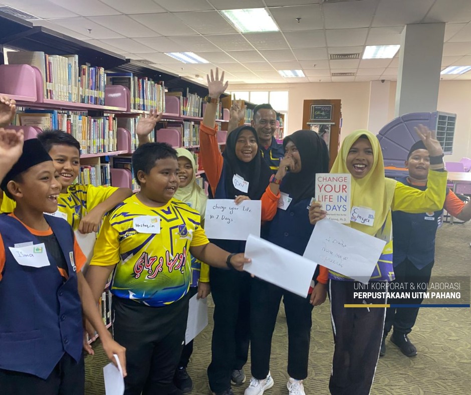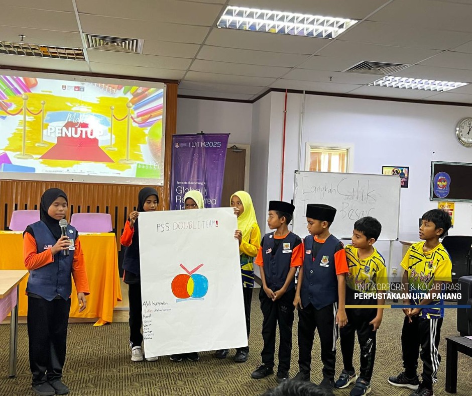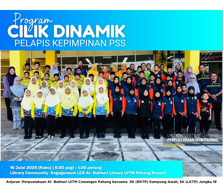 BANDAR JENGKA, 16 Julai 2025 – Seramai 50 murid sekolah rendah telah menyertai Program Cilik Dinamik: Pelapis Kepimpinan PSS yang berlangsung di Library Community Engagement (LCE), Perpustakaan Al-Bukhari, UiTM Cawangan Pahang hari ini. Program ini merupakan inisiatif Perpustakaan Al-Bukhari dalam usaha melahirkan pelapis kepimpinan Pusat Sumber Sekolah (PSS) yang berpotensi, berdaya saing dan yakin diri dalam kalangan murid sekolah rendah.