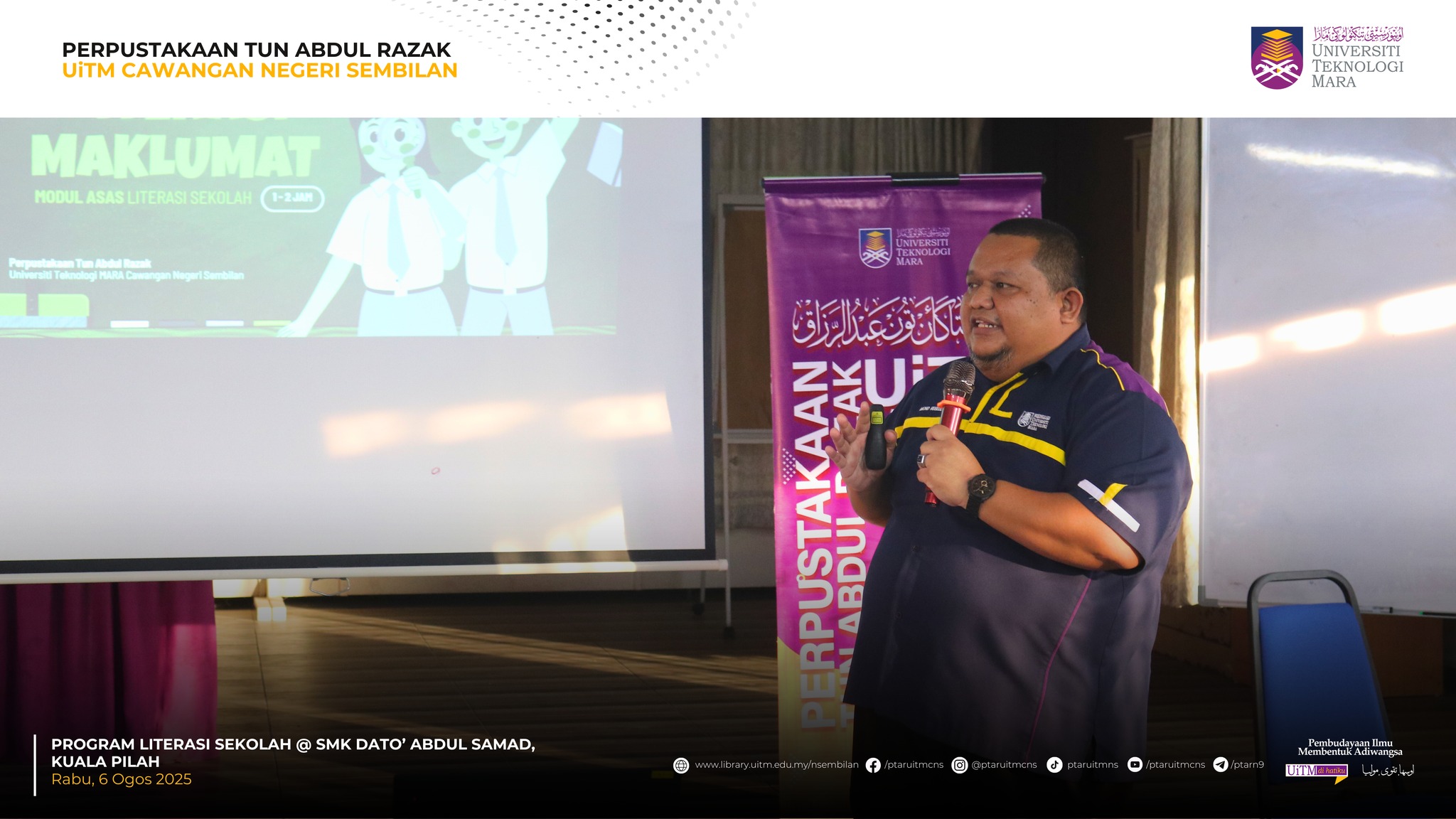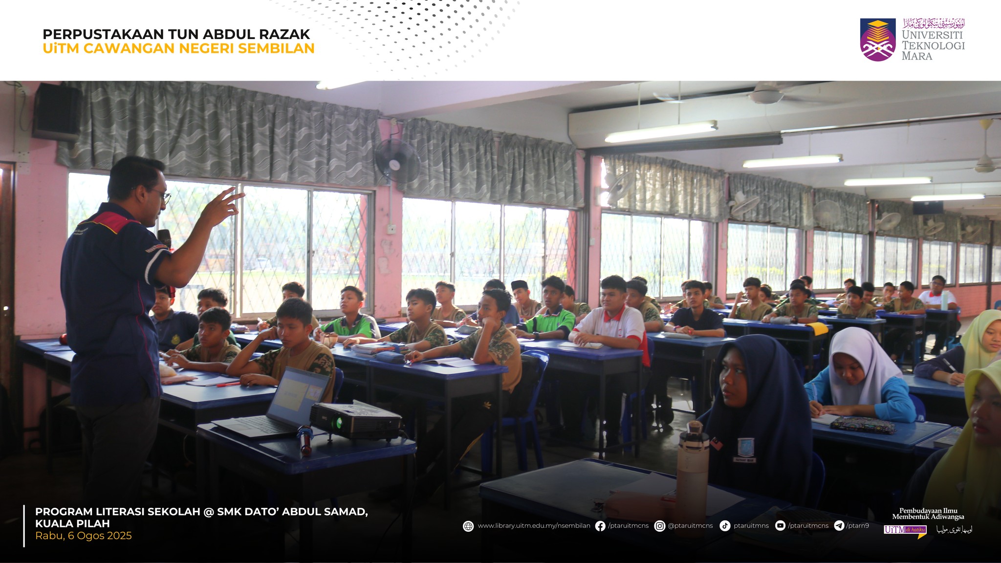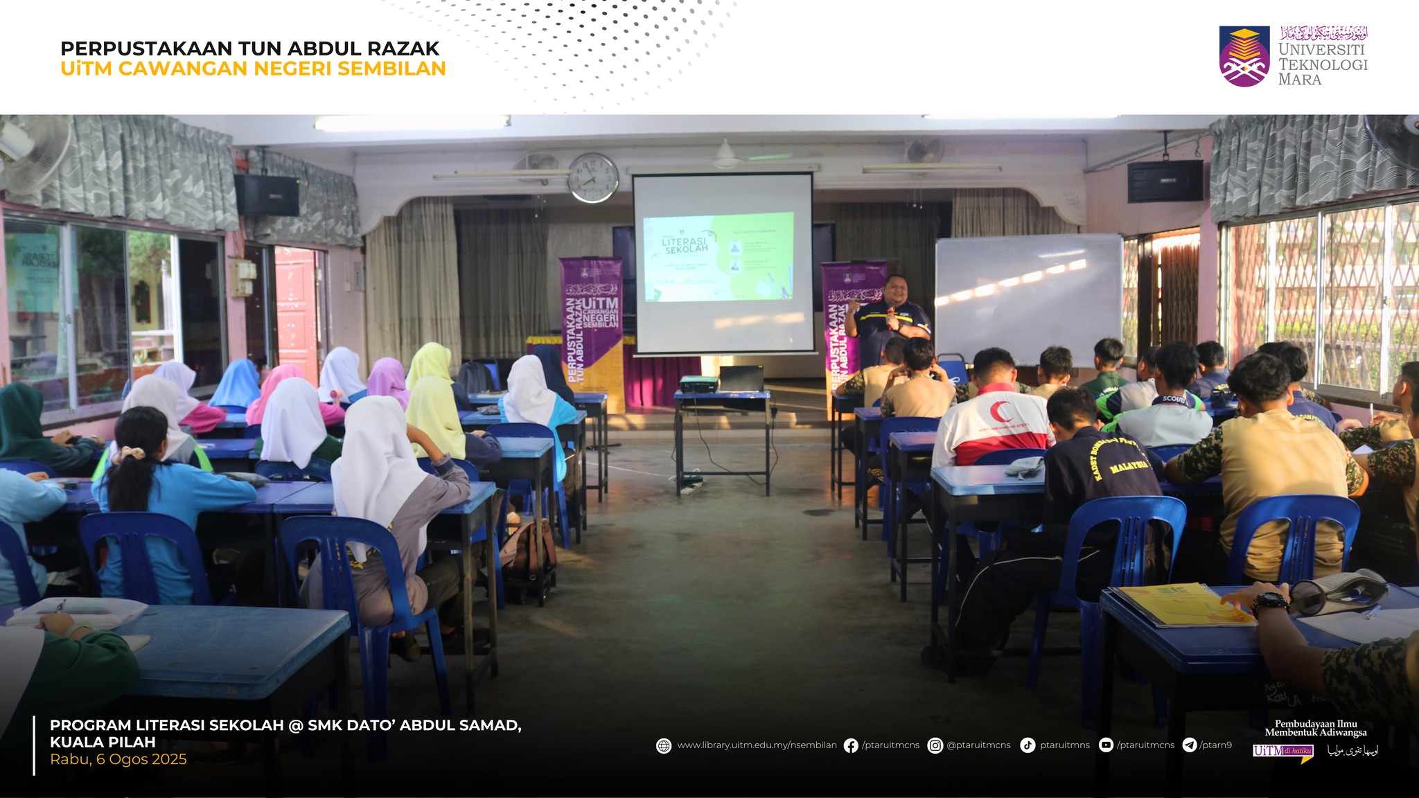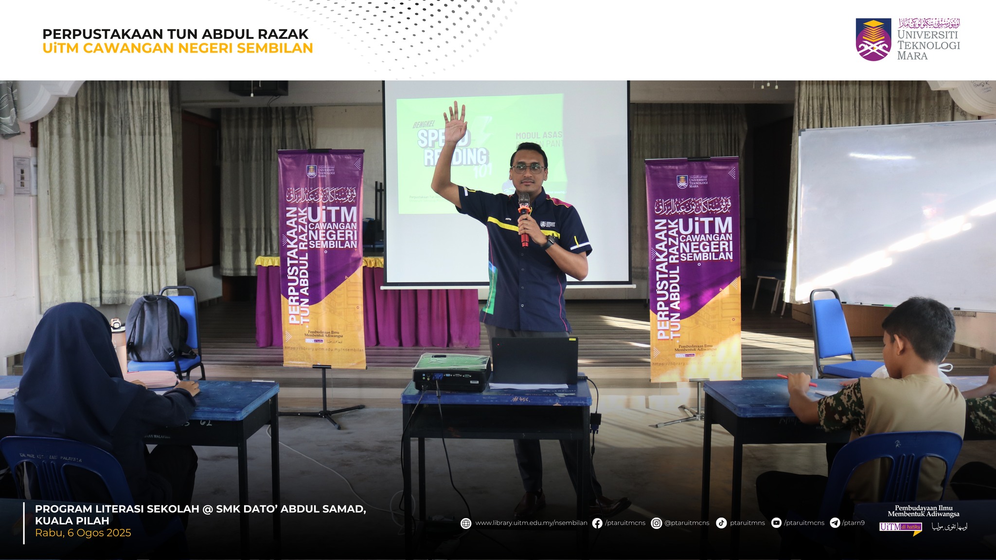 KUALA PILAH, 6 Ogos 2025 - Perpustakaan Tun Abdul Razak UiTM Cawangan Negeri Sembilan Kampus Kuala Pilah telah menganjurkan program Literasi Sekolah bersama SMK Dato' Abdul Samad, Kuala Pilah. Pengisian program termasuklah slot Literasi Maklumat yang disampaikan oleh Encik Mohd Rusedzwan Mohd Idris, Pembantu Pustakawan Kanan dan slot Speed Reading 101 bersama Encik Muhammad Shafiq Amirullah, Pustakawan PTAR Kampus Kuala Pilah yang telah disertai oleh pelajar-pelajar Tingkatan 2.