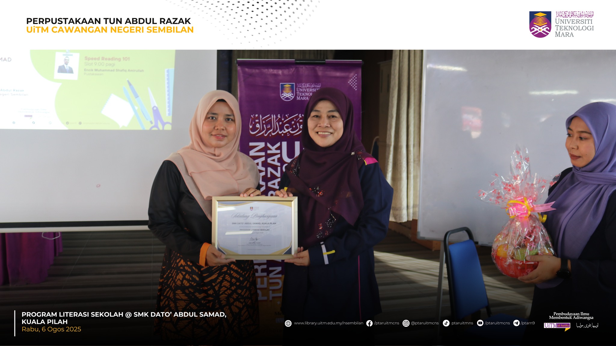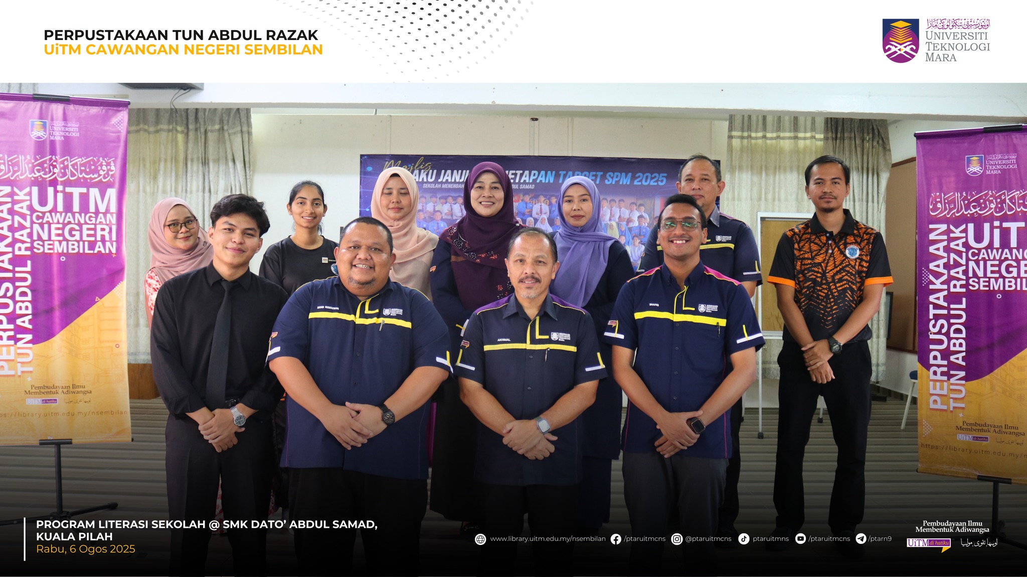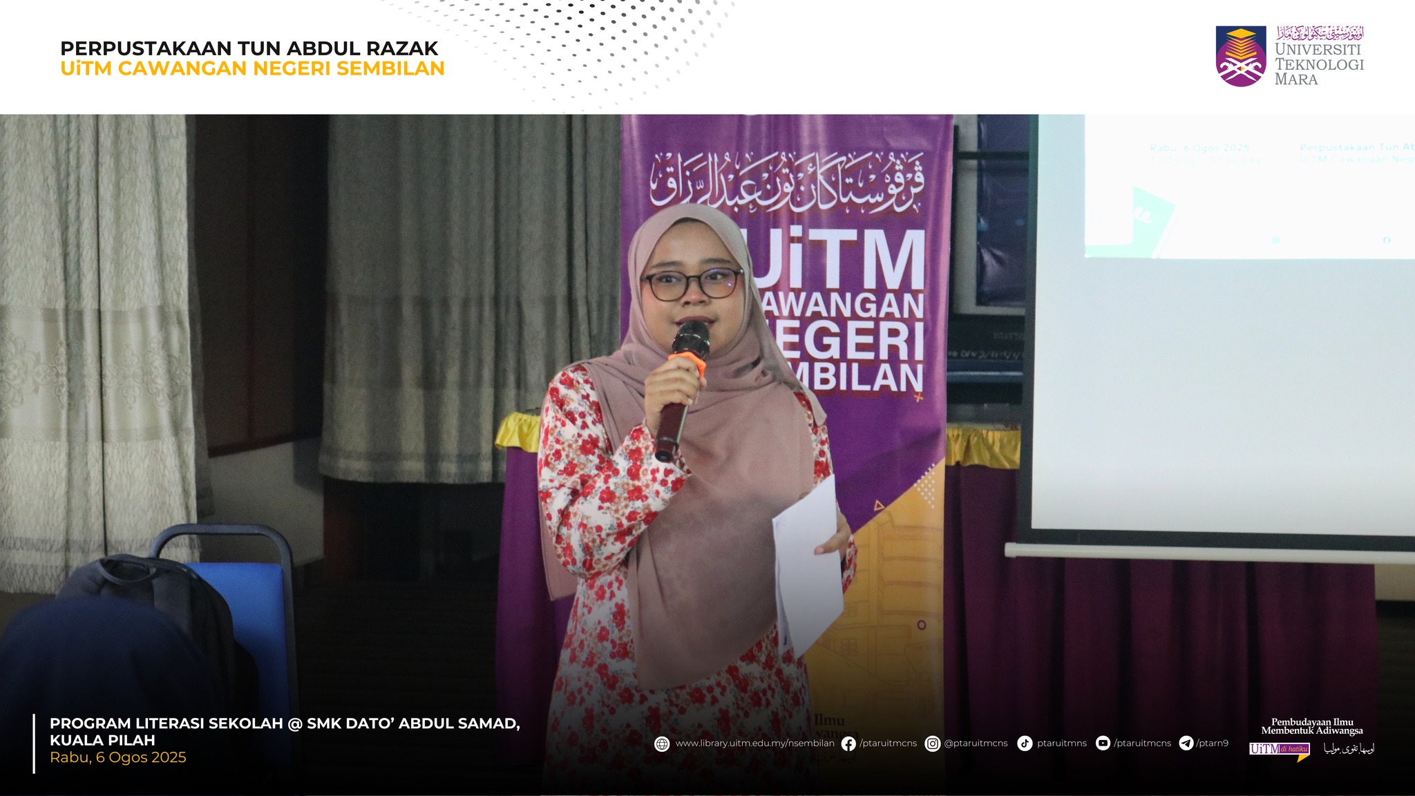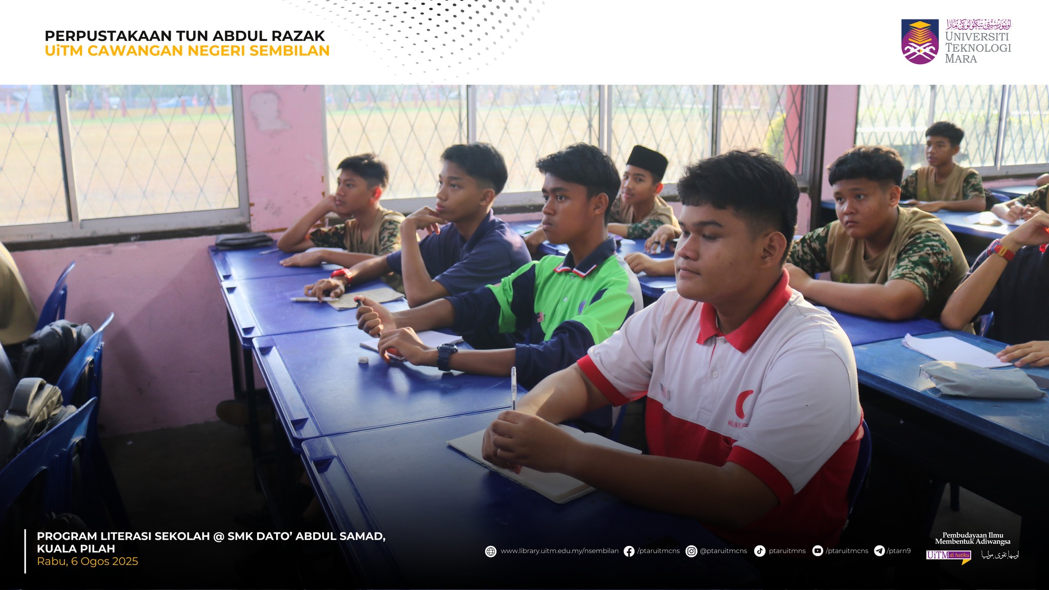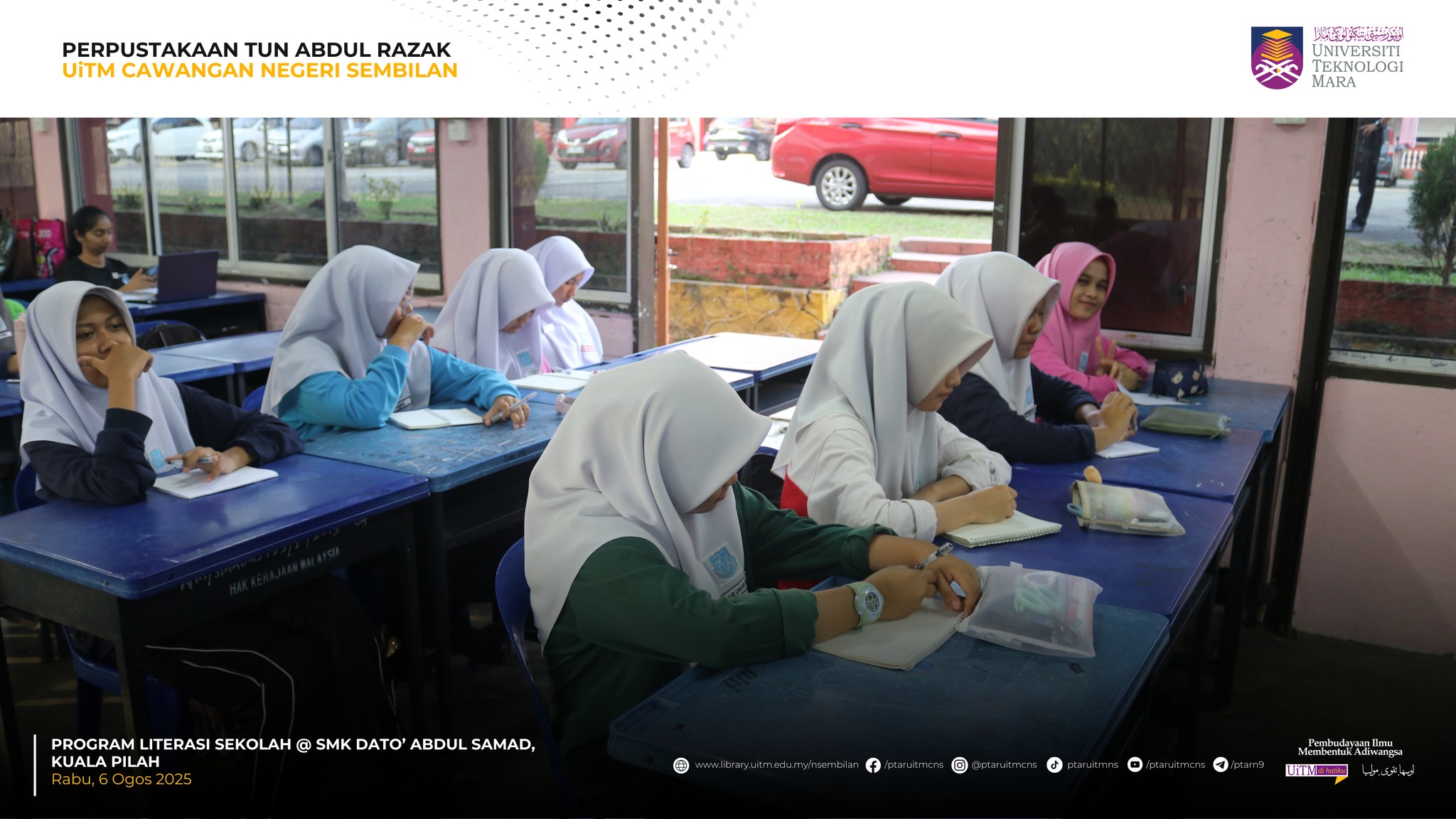 KUALA PILAH, 6 Ogos 2025 - Perpustakaan Tun Abdul Razak UiTM Cawangan Negeri Sembilan Kampus Kuala Pilah telah menganjurkan program Literasi Sekolah bersama SMK Dato' Abdul Samad, Kuala Pilah. Pengisian program termasuklah slot Literasi Maklumat yang disampaikan oleh Encik Mohd Rusedzwan Mohd Idris, Pembantu Pustakawan Kanan dan slot Speed Reading 101 bersama Encik Muhammad Shafiq Amirullah, Pustakawan PTAR Kampus Kuala Pilah yang telah disertai oleh pelajar-pelajar Tingkatan 2.