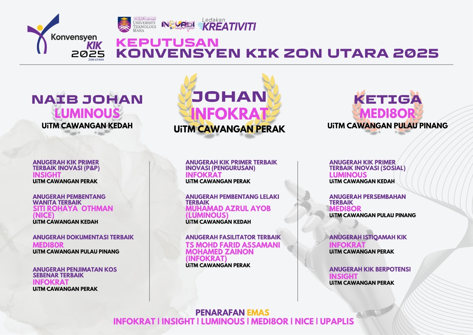 13 September 2025 – Perpustakaan Sultan Badlishah (PSB), UiTM Cawangan Kedah sekali lagi mencatat kejayaan apabila Kumpulan Inovatif & Kreatif (KIK) Luminous berjaya meraih gelaran Naib Johan dalam Konvensyen KIK Peringkat Zon Utara 2025 yang berlangsung secara atas talian pada 10 hingga 12 September 2025.