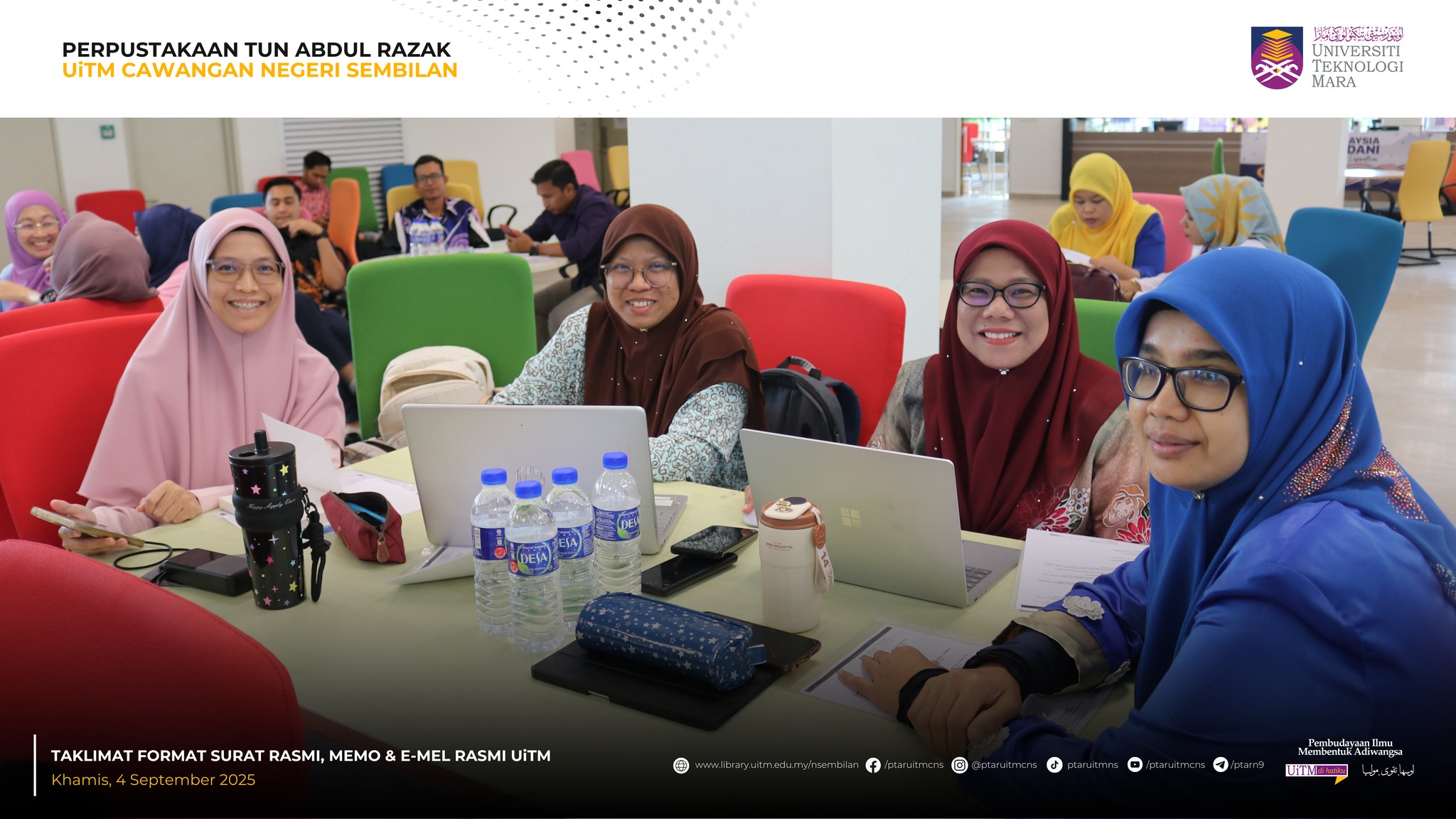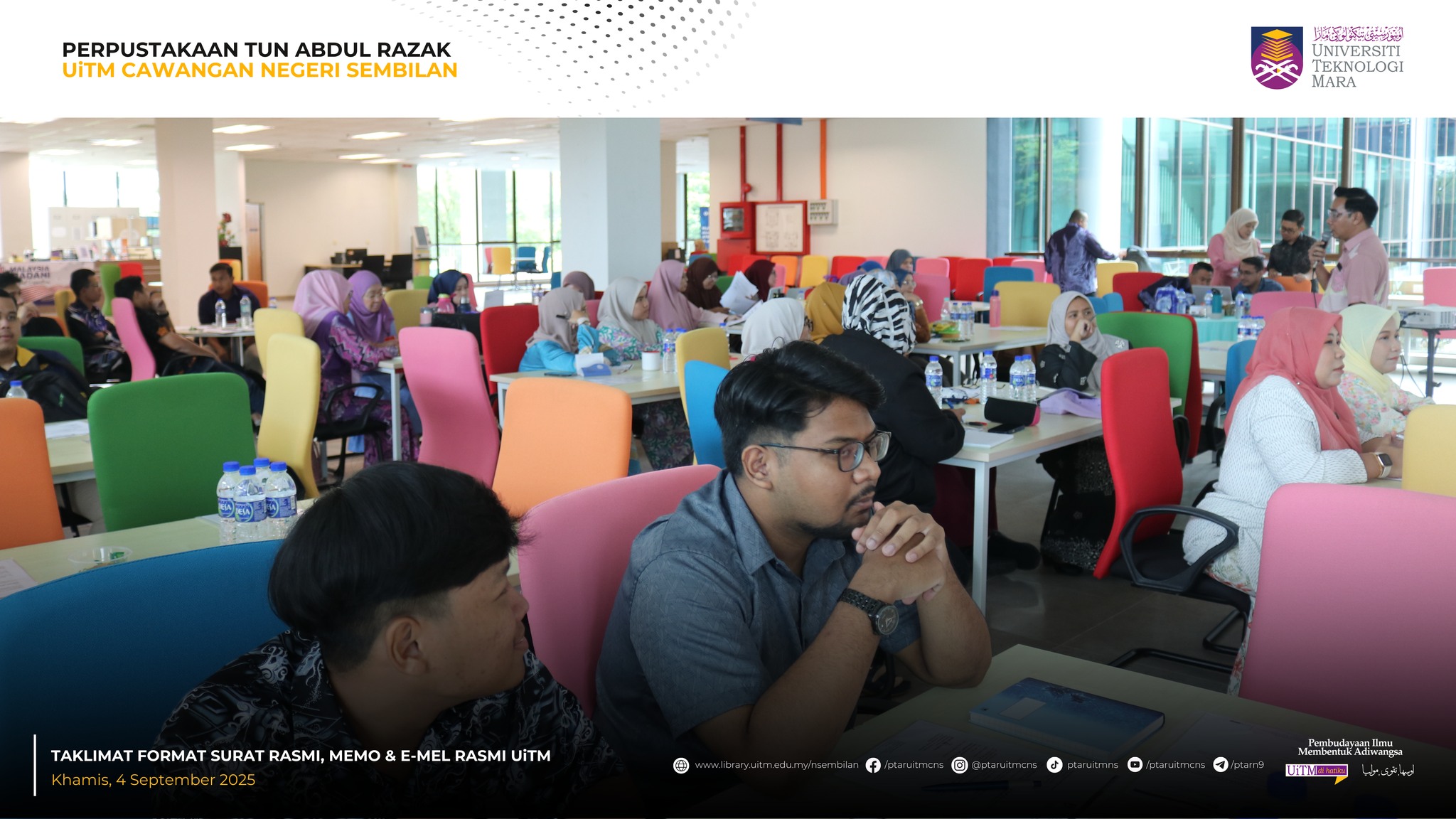 Seremban, 4 September 2025 - Perpustakaan Tun Abdul Razak UiTM Cawangan Negeri Sembilan menerusi Unit Arkib Cawangan telah menganjurkan Taklimat Format Surat Rasmi, Memo & E-mel Rasmi UiTM yang berlangsung pada minggu lepas di Ruang Library Community Engagement, PTAR Kampus Seremban.