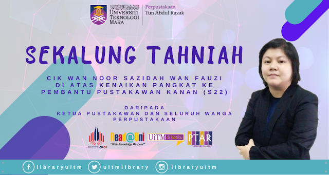 Pihak Perpustakaan Tun Abdul Razak ingin mengucapkan syabas & tahniah kepada Cik Wan Noor Sazidah Wan Fauzi (S22) atas Kenaikan pangkat berkuatkuasa mulai 16 Mac 2020.