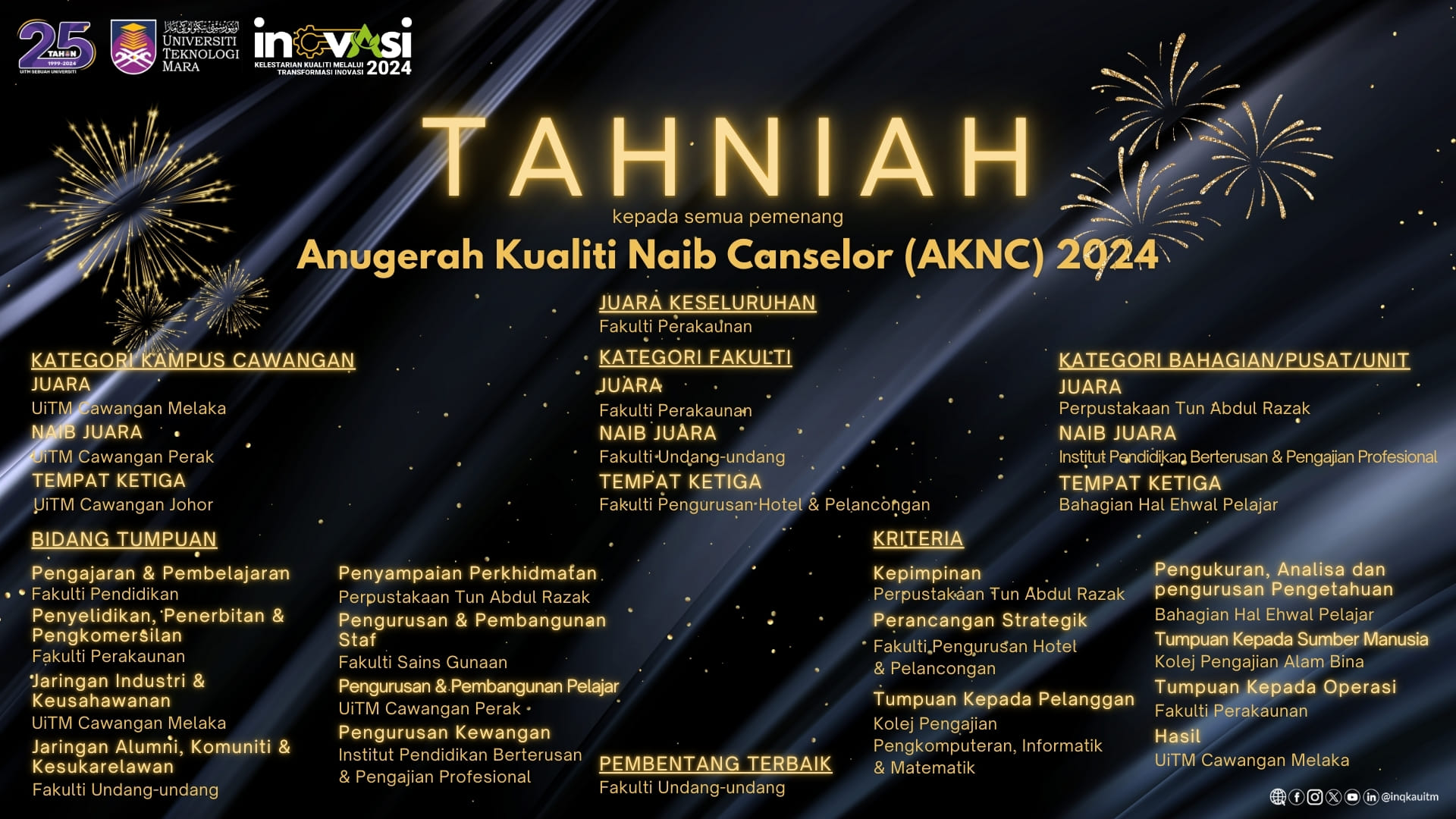 Pelaksanaan i-AKNC mencerminkan komitmen berterusan InQKA dalam memperkukuh budaya kerja berkualiti dan cemerlang di UiTM melalui tadbir urus AKNC yang lebih mesra pengguna, efisien dan berintegriti. Objektif utama i-AKNC (Vice Chancellor’s Intelligent Quality Award) adalah untuk menyediakan kemudahan kepada Pusat Tanggungjawab (PTJ) dalam menulis dan menjana laporan AKNC yang komprehensif melalui sistem maklumat dalam talian yang bersepadu dan efisien. Inisiatif ini memastikan setiap PTJ dapat melaksanakan proses pelaporan dengan lebih sistematik, tepat dan mudah diakses. Selain itu, i-AKNC bertujuan mewujudkan proses penganugerahan, penilaian dan penilaian kerja AKNC yang konsisten serta berintegriti. Pendekatan ini menekankan ketelusan dan keadilan dalam setiap peringkat pelaksanaan bagi menjamin kualiti serta kredibiliti hasil penilaian.