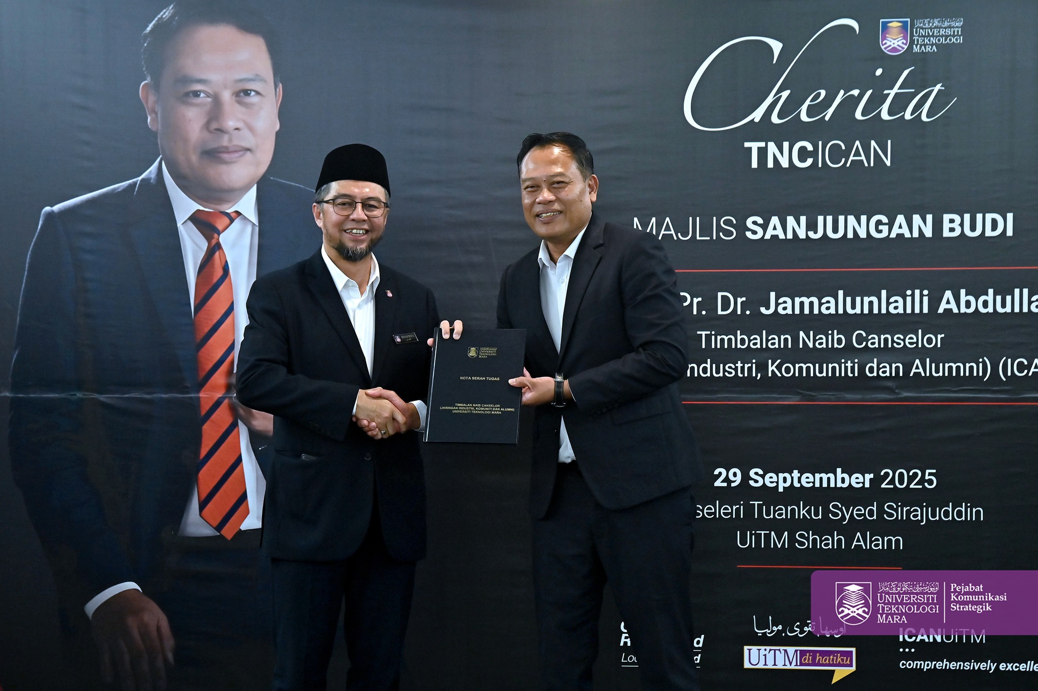 Universiti Teknologi MARA merakamkan setinggi-tinggi penghargaan kepada YBrs. Profesor TPr. Dr. Jamalunlaili Abdullah, Timbalan Naib Canselor (Jaringan Industri, Komuniti dan Alumni) atas segala jasa, khidmat bakti dan kepimpinan cemerlang yang telah mencorakkan perjalanan ICAN sepanjang tempoh perkhidmatan beliau. Majlis Sanjungan Budi telah berlangsung pada 29 September 2025 di Canseleri Tuanku Syed Sirajuddin UiTM. Majlis dihadiri Professor Datuk Dr Shahrin bin Sahib@Sahibuddin, Naib Canselor serta barisan pengurusan UiTM.