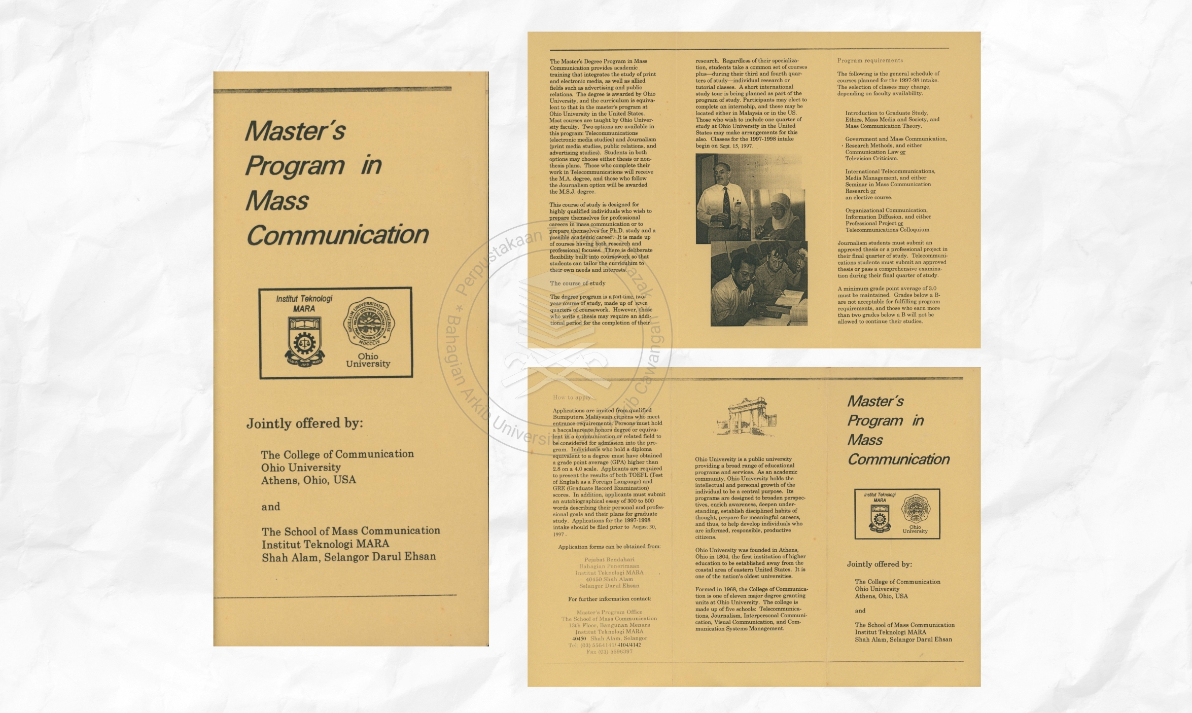 Brosur ini merupakan keluaran lama daripada Institut Teknologi MARA ini. Brosur berukuran 29.8 sentimeter x 21 sentimeter ini memaparkan penawaran awal Program Sarjana Komunikasi Massa pada tahun 1997. Diterbitkan ketika institusi ini masih dikenali sebagai ITM, dengan tawaran bersama oleh The College of Communication, Ohio University.
