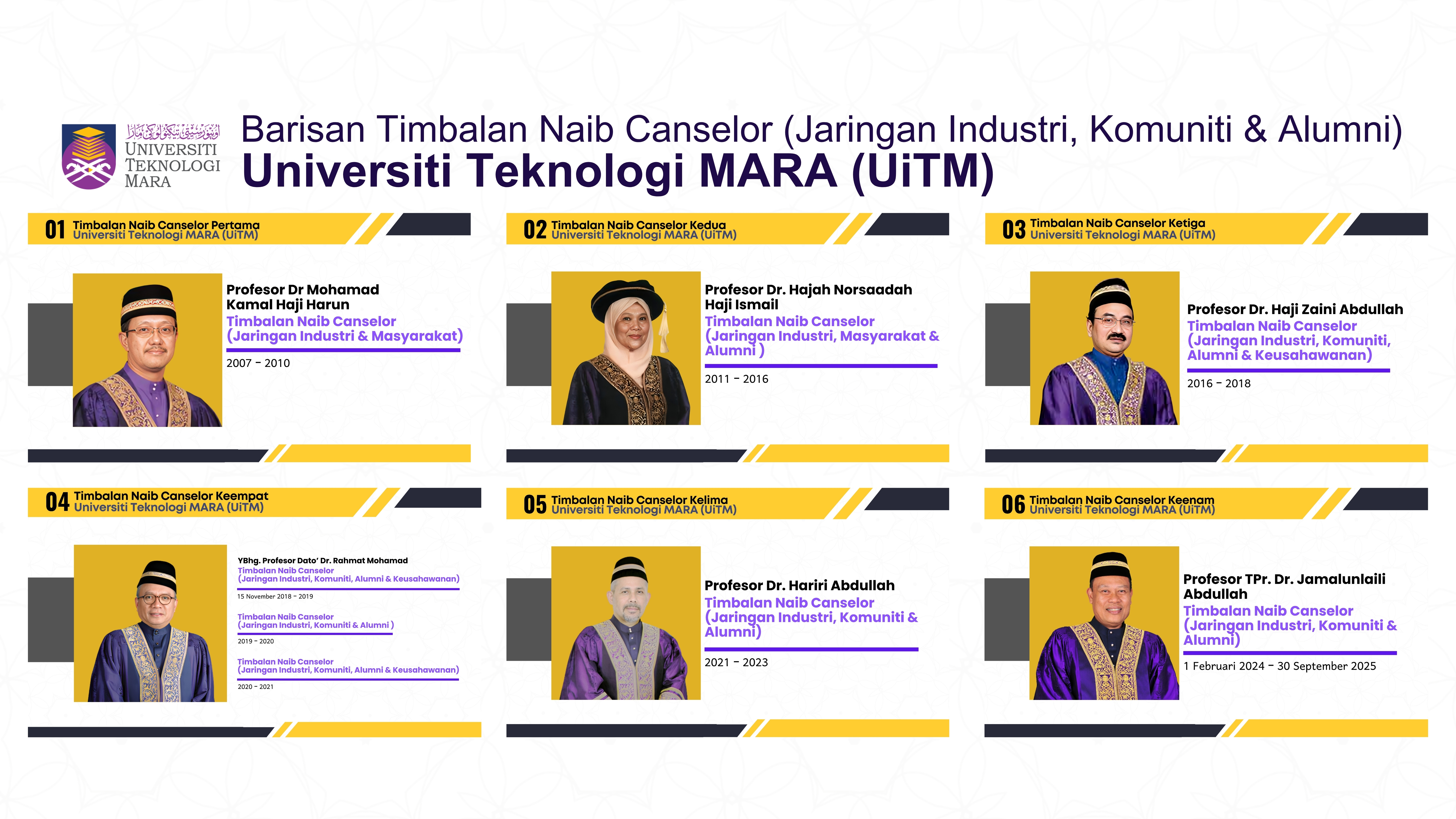 Universiti Teknologi MARA (UiTM) sentiasa melahirkan pemimpin unggul yang mendukung misi jaringan industri, komuniti & alumni. Dari tahun 2007 hingga kini, enam tokoh telah memacu UiTM dalam memperkukuh kerjasama strategik, memperluas jaringan keusahawanan serta mengangkat nama universiti di peringkat global.