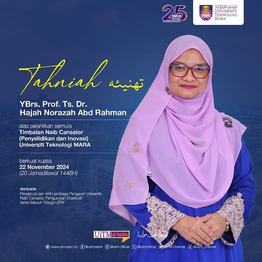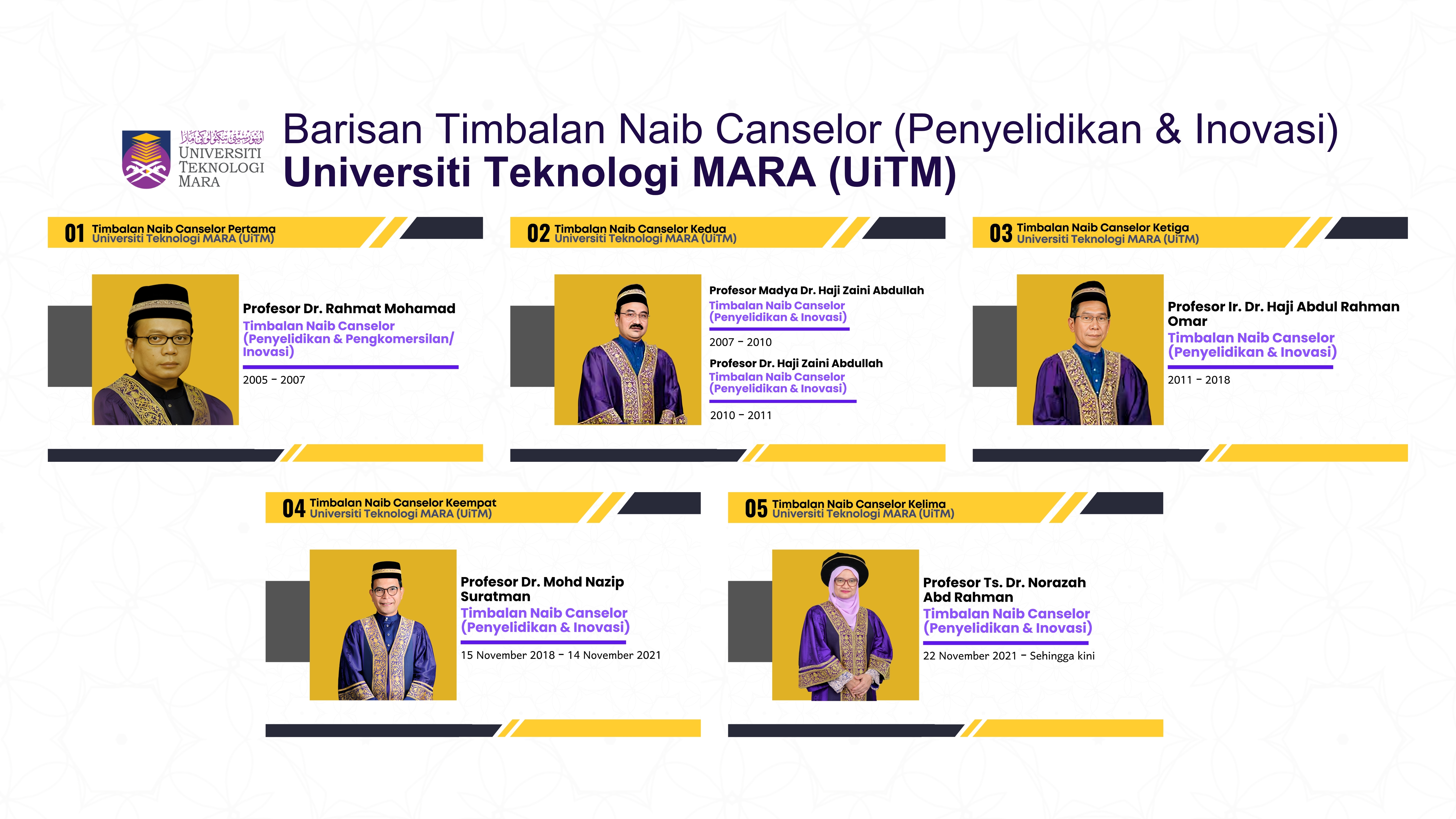 Universiti Teknologi MARA (UiTM) terus melakar kecemerlangan dalam bidang penyelidikan dan inovasi dengan kepimpinan mantap barisan Timbalan Naib Canselor (Penyelidikan & Inovasi). Bermula pada tahun 2005 dengan pelantikan Profesor Dr. Rahmat Mohamad, legasi ini diteruskan oleh tokoh-tokoh hebat seperti Profesor Madya Dr. Haji Zaini Abdullah, Profesor Ir. Dr. Haji Abdul Rahman Omar, dan Profesor Dr. Mohd Nazip Suratman. Kini, kepimpinan diteruskan oleh Profesor Ts. Dr. Norazah Abd Rahman sejak 2021, yang menerajui UiTM ke arah masa depan penyelidikan bertaraf global.